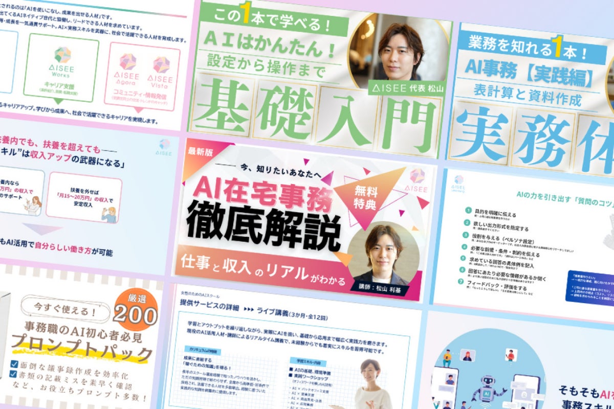 ・公式LINE登録および無料個別面談参加のみなさまへ、AI事務についてより詳しい情報が得られる無料講座パックをプレゼントいたします。