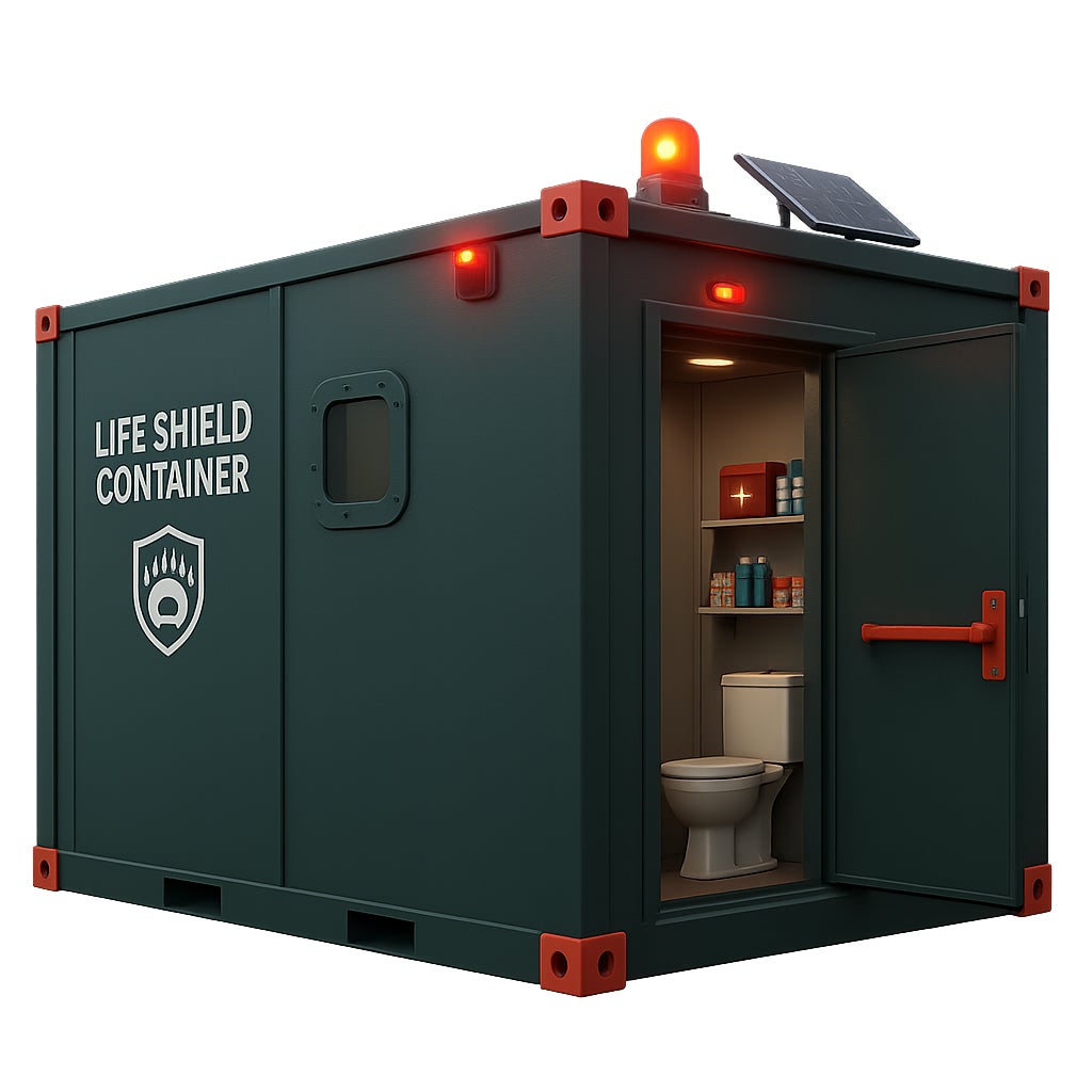 ジャカコン東日本は、その解決策を国際規格の海上輸送コンテナ――“世界で最も強い箱”に見出しました。20トンを超える荷重に耐える強靭な構造をもとに、内部には簡易トイレ、水、救急箱、ランタンを備えたシンプルかつ多機能な避難ユニットとして再設計しました。