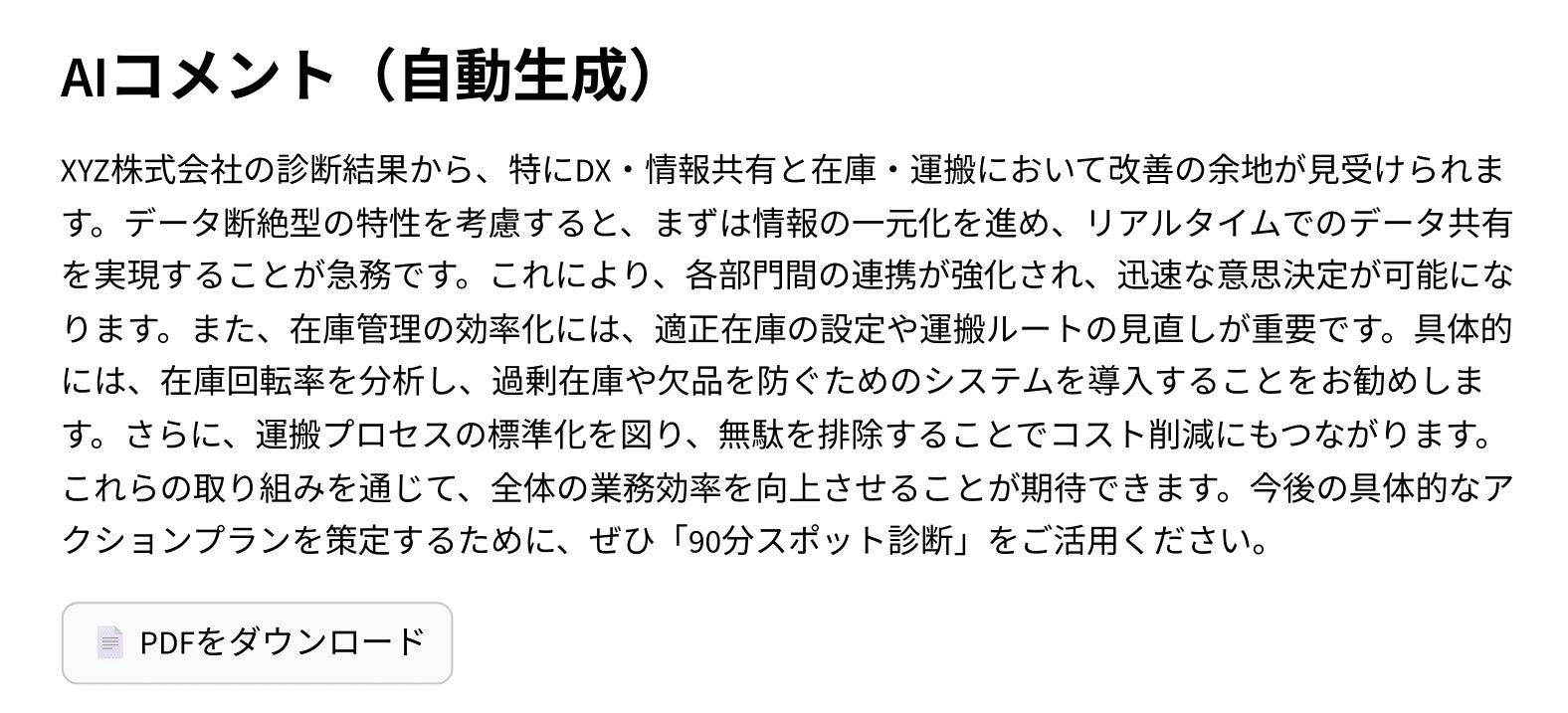 診断結果をもとに、AIが企業の状態を読み取り、数百字のコメントとして“改善の入口”を提示。
