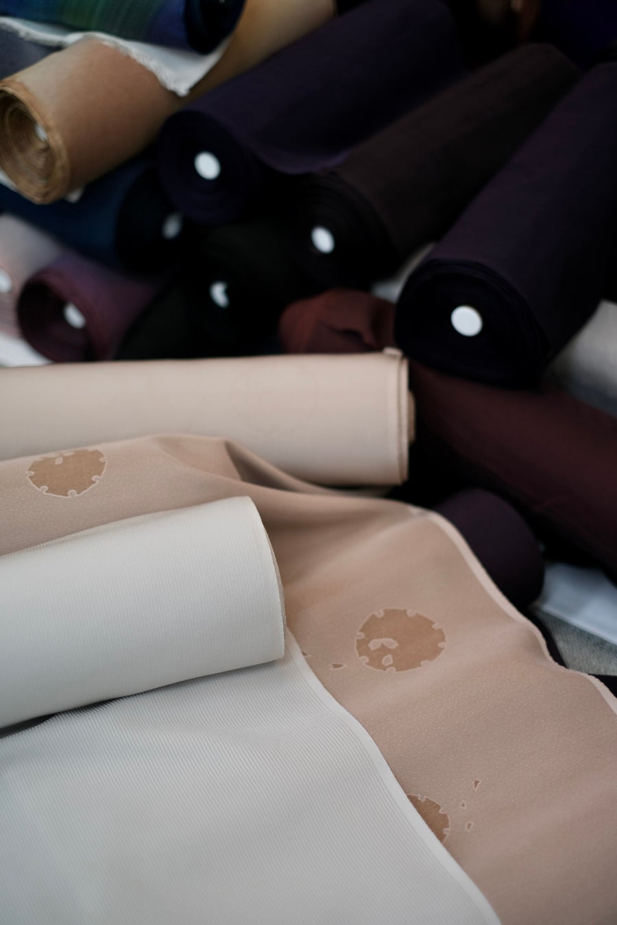 サテン(山梨県)、ベルベット・クレープ生地(京都府)、ミカド(山形県)、メンズスーツで用いられるウール生地(愛知県)など、主に国内で生産された上質な生地を使用し、セミオーダー式で仕立てています。着物生地は、滋賀県の伝統的工芸品に指定されている「輪奈ビロード」や「浜ちりめん」といったシルク(絹織物)を取り入れています。
