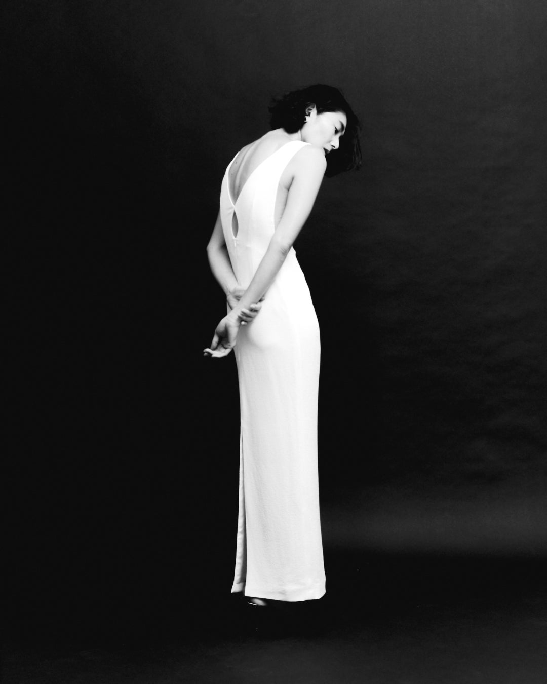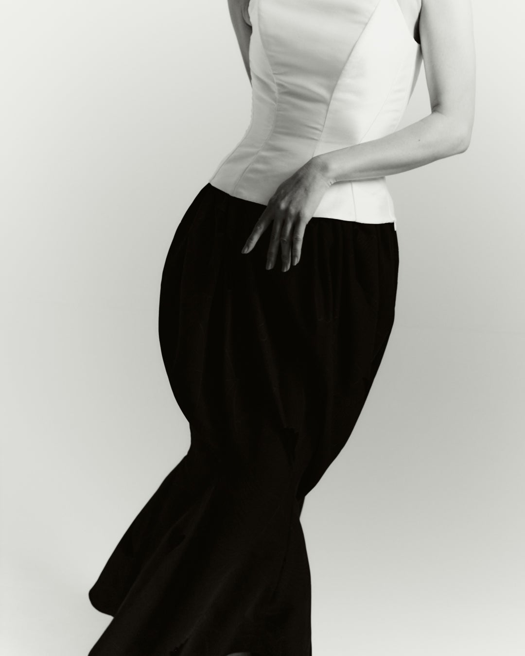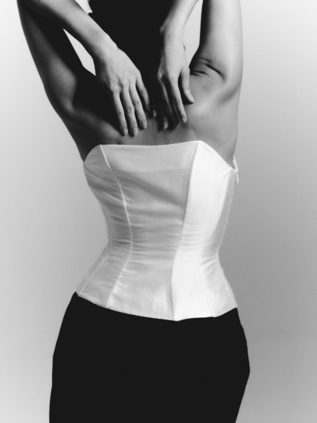 肌の露出が計算されたビスチェ。デコルテや背中を美しく見せる一方で、胸元は上品に隠し、わきの下のラインは柔らかな曲線を描きながらなだらかに落とし、肩甲骨に沿って上がるようなフォルムに仕立てています。