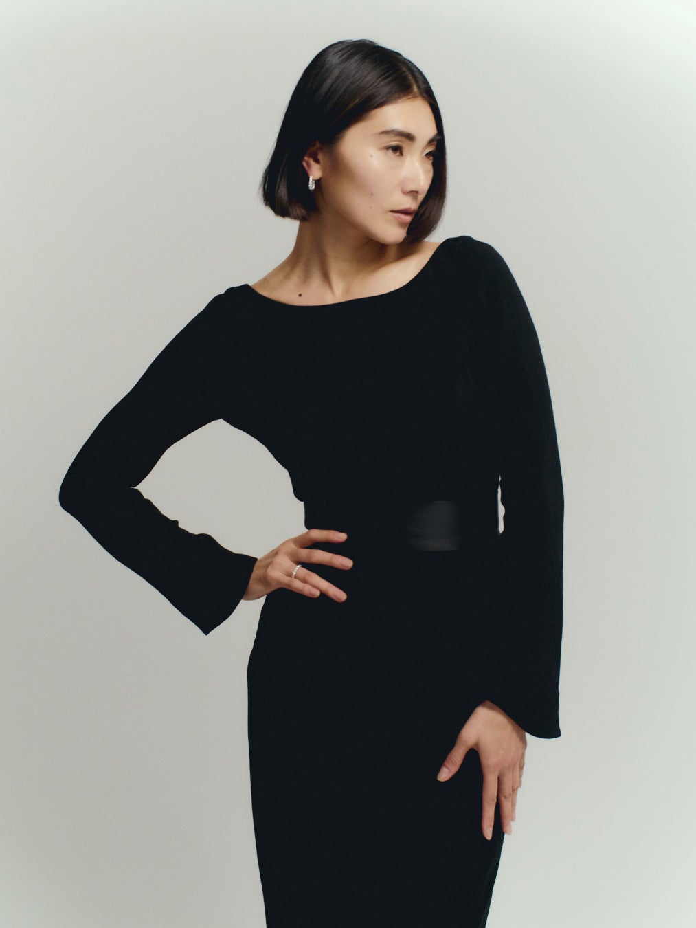 ボートネックのフロントに、背中を大きく開いたバックスタイル。手の甲にかかる長めの袖が、腕のラインを美しく見せるとともに、手元のジュエリーを際立たせます。