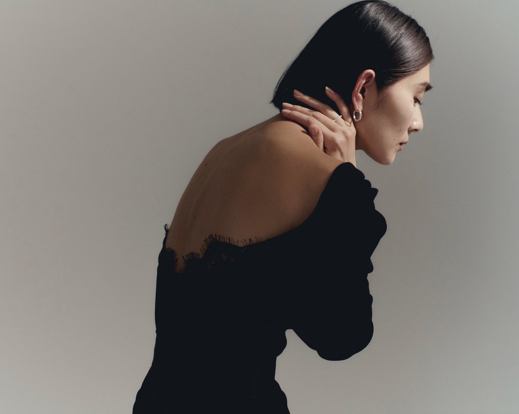 日本の生地と海外のドレス生地は織りや質感がまったく異なります。だからこそ、シンプルなデザインであってもどこかオーセンティックな雰囲気が漂い、独自の存在感を放つ。今回のコレクションでは、その「静かな強さ」を、私自身の理想とするフォルム──“Veiled in Reverie” の世界観の中で表現しました。
