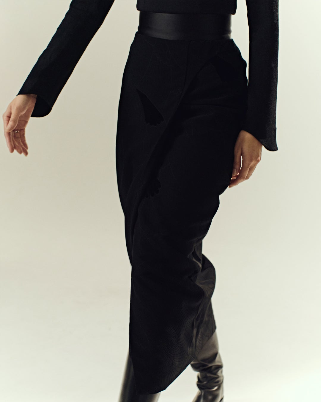 歩くたびに足元がさりげなくのぞく巻きスカート。腰回りの曲線に沿うように全体を丸みのあるフォルムで仕立て、前身頃は腰骨のラインに合わせてカッティングしています。