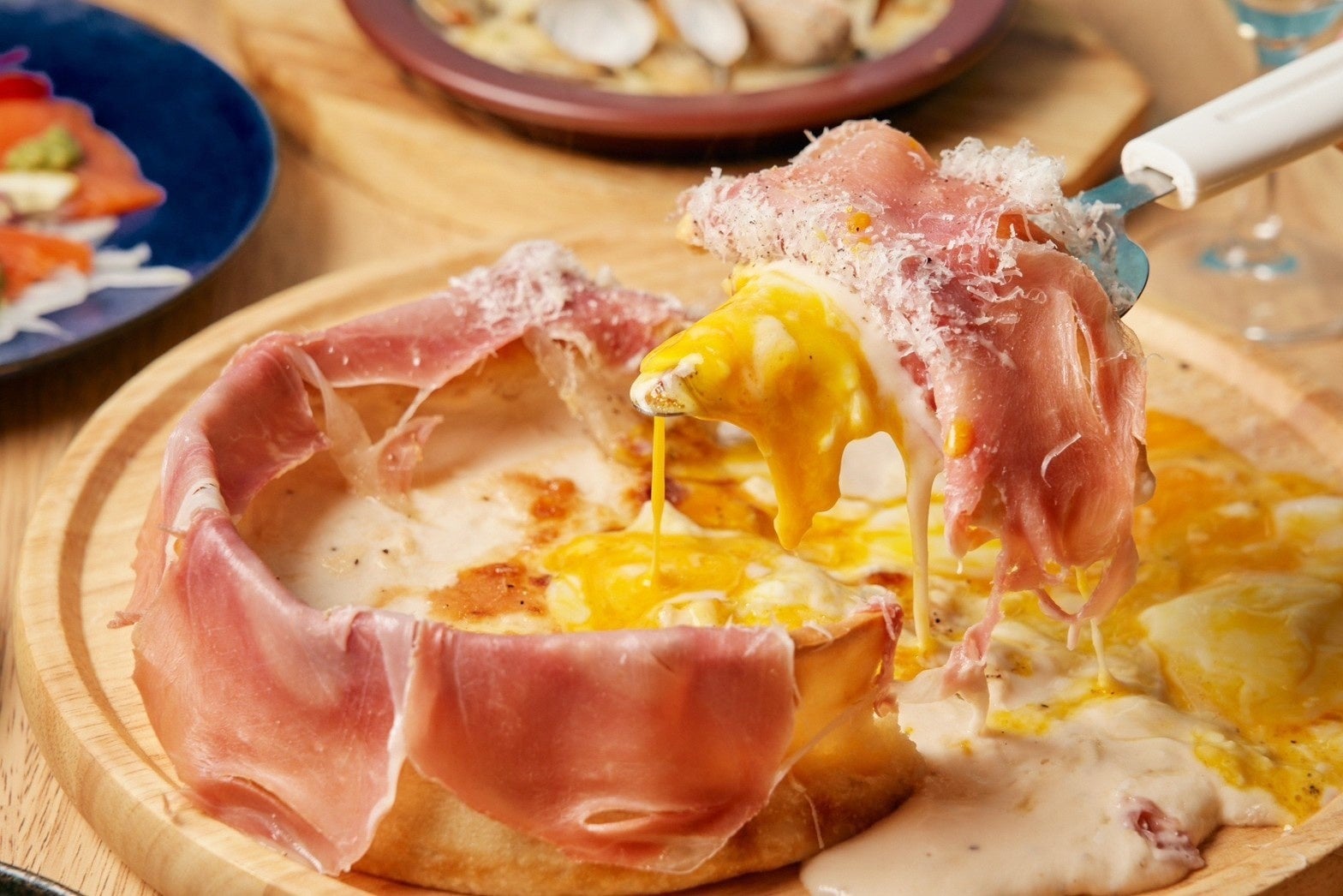 チーズは、フランスやイタリアなど世界各国から約10種類をそろえています。生地を切るとチーズが流れ出す不動の人気ナンバー1の 「生ハム温玉シカゴピザ」(2,189円)をはじめ 、チーズの種類を選べる「チーズフォンデュ」(2種、1,540円~)、フライドポテトの上にチェダーチーズと半熟卵、さらに削りたてのパルミジャーノをたっぷりかけた「天使のチーズフライドポテト」(990円)など創作チーズ料理をラインナップ。赤ワインソースがジューシーな赤身肉の旨味を引き立てる「厳選牛赤身のステーキ 赤ワインソース」(2,178円)、パルメザン・レッドチェダー・グラナパダーノの3種類のチーズをトッピングした「チーズ!チーズ!チーズ!カルボナーラ」(1,540円)など約70種類のメニューをご用意しています。お通しは、550円で自家製フォカッチャが食べ放題です。