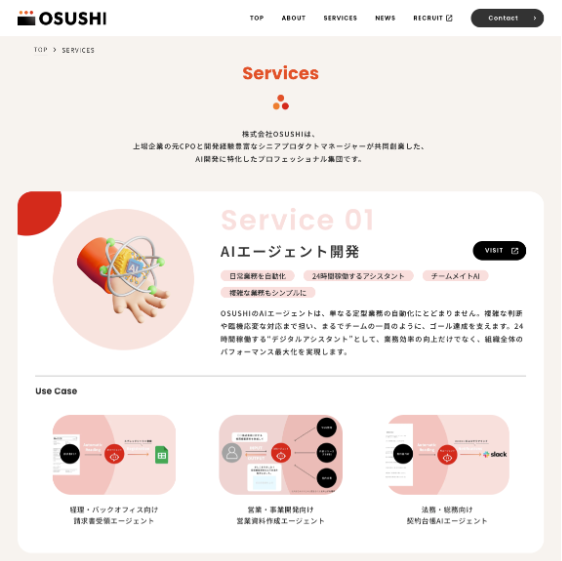 AI開発に特化したプロフェッショナルチーム株式会社OSUSHI(本社:東京都渋谷区、代表取締役 CEO:田本 諒)は、2025年12月6日(土)にコーポレートサイトを全面リニューアルし、公開いたしました。