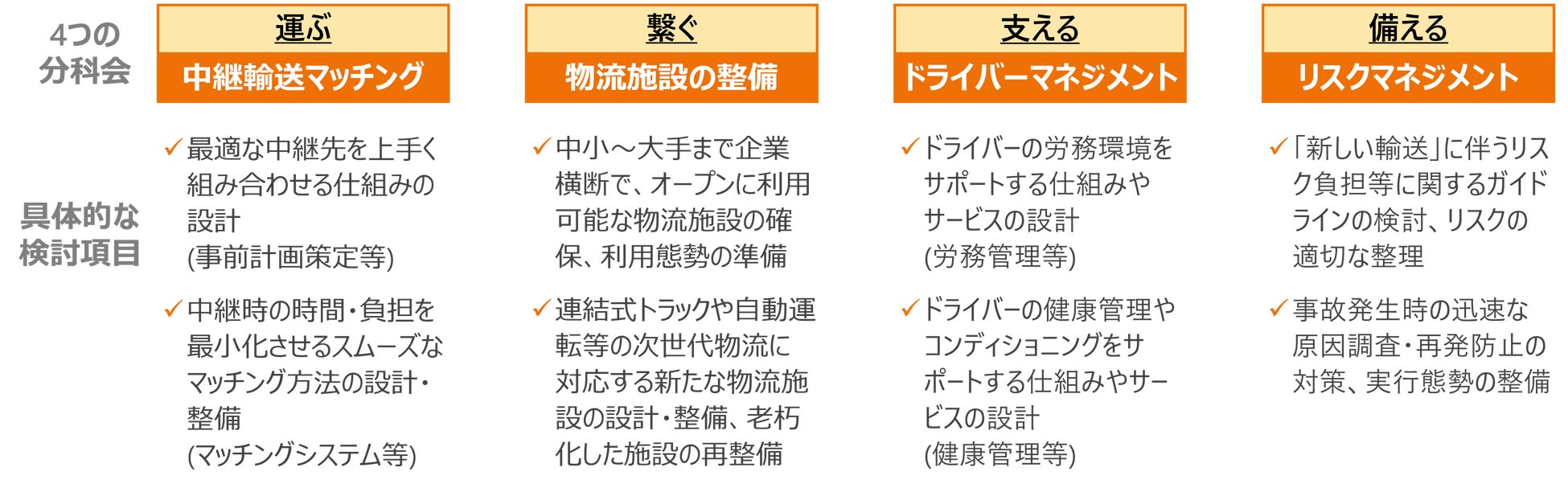 また、中継輸送に次ぐ取り組み領域として、ドライバーの労務環境や健康状態の改善を通じ、効率的で持続可能な物流の構築を目指します。これらの実現に向けて、4つの分科会活動を本格的に稼働させ、企業や業界を超えた価値共創に取り組んでまいります。
