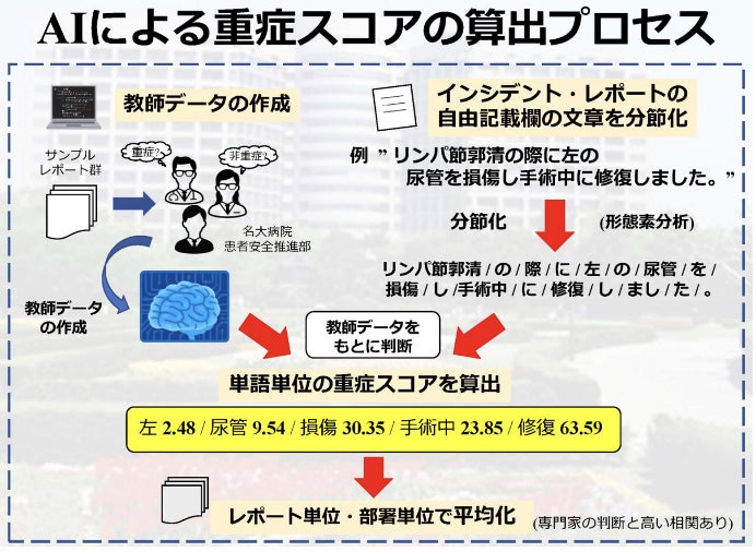 本研究グループは、名大病院の所有する膨大なインシデントレポートのテキストデータを機械学習の技術を用いて分析し、ある医療者集団が、医療行為そのものや、不十分な確認行動などによって患者に生じさせた疾病の「重症度」や「過失性」を数値化することに成功しました。その結果は、同院で患者安全の専門家たちによって分析されてきたデータと比較しても高い相関が示されたことが評価され、2022年12月12日付「Journal of Medical Systems」、2024年10月11日付「BMJ Health Care Informatics」に掲載されました。この手法は名大病院で長期にわたって蓄積されてきたインシデントレポートのデータと、AI技術を融合させて開発されたもの(※3)で、 患者安全という分野において全く新しい物差しとして注目され、医療事故防止など、患者の安全確保への貢献が期待されています。