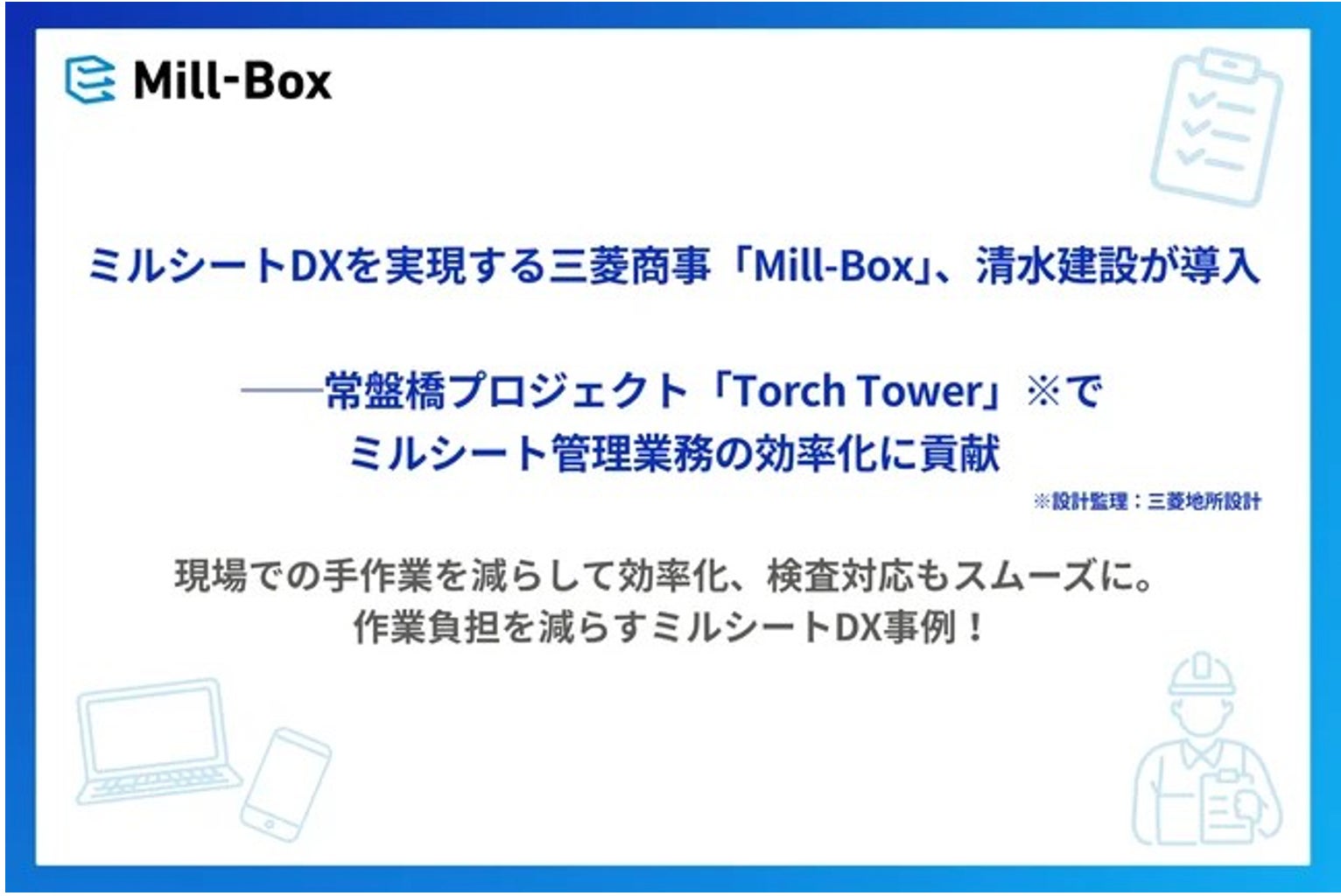 ミルシートDXを実現する三菱商事「Mill-Box」、清水建設が導入──常盤橋プロジェクト「Torch Tower」(設計監理:三菱地所設計)でミルシート管理業務の効率化に貢献