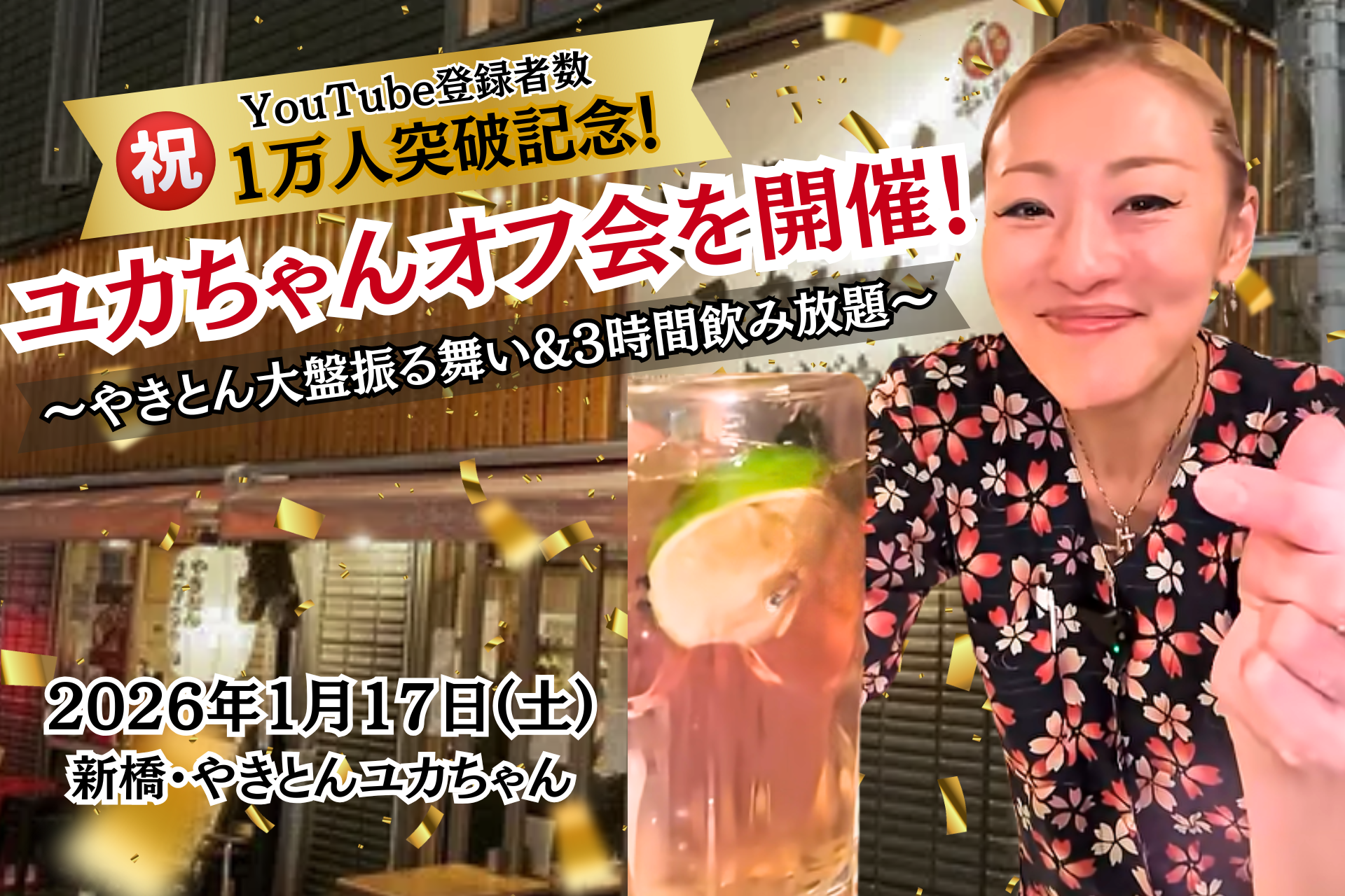 『豚一筋17年。価格以上のこだわりで無限の感動と、あふれる笑顔を』をコンセプトに、やきとん・豚ホルモン焼きに特化した飲食店ブランド【ふじ嶋グループ】(麻布ふじ嶋本店/やきとんユカちゃん/ホルモンユカちゃん)を展開する株式会社Infinity8(東京都港区、代表取締役:藤嶋健一)は、新橋のやきとん専門店「やきとんユカちゃん」にて、2026年1月17日(土)16:00~19:00、オーナー・藤嶋由香(通称:ユカちゃん)による初のオフ会イベントを開催いたします。本イベントは、ユカちゃんが営業中のライブ配信を中心として展開をしているYouTubeチャンネル『やきとんユカちゃんねる』のチャンネル登録者数1万人突破を記念したものです。 かつてコロナ禍の窮状をストレートに訴えメディアの注目を集めた新橋の名物女将が、今度は「デジタル」を通じて全国のファンと繋がり、その感謝を込めて3時間飲み放題付きでやきとん・豚料理を大盤振る舞いいたします。また元プロジャズシンガーであるユカちゃんの特別ミニライブも行い、食とエンターテイメントを融合した一夜限りの特別企画です。