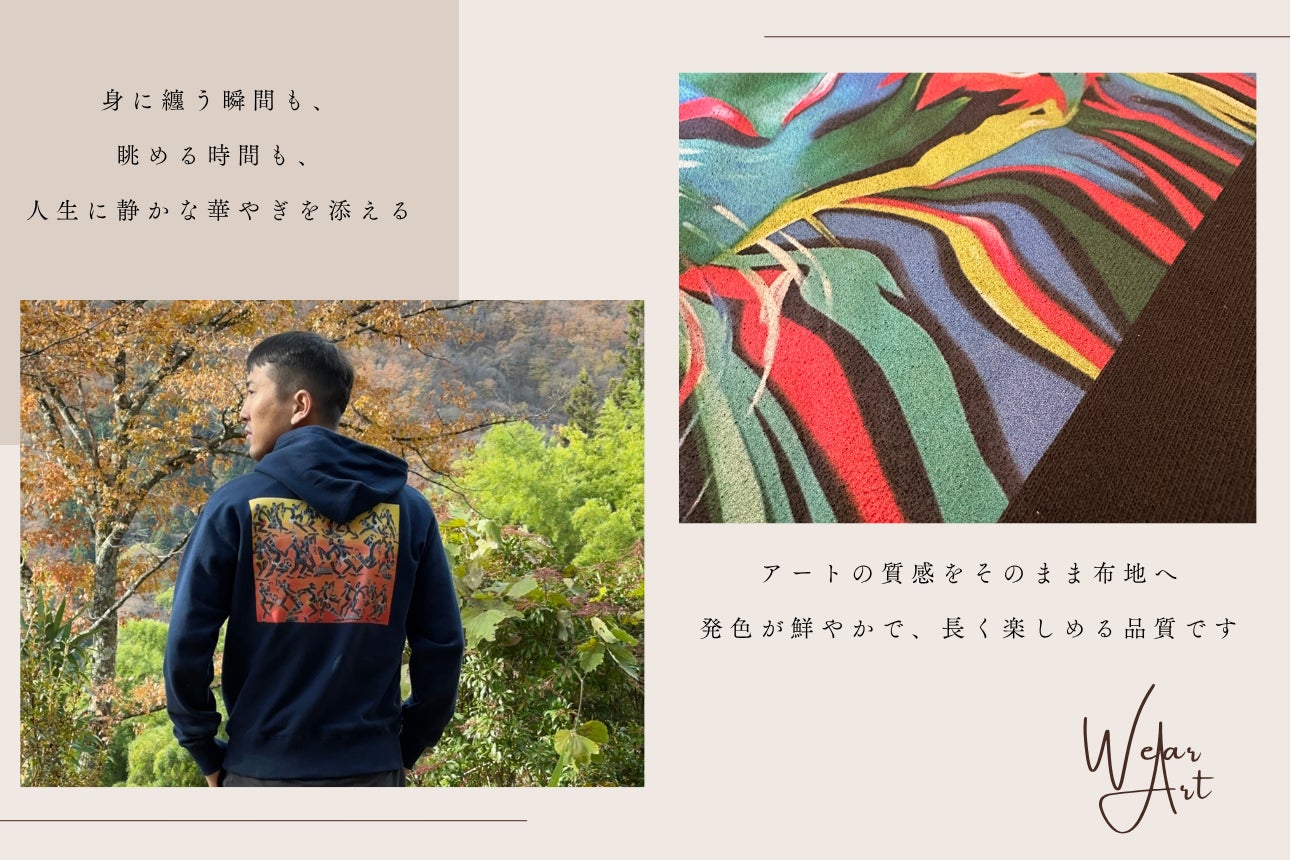 支援者には、アフリカンアートをデザインしたTシャツやスウェット、パーカーを提供します。さらに、自分で好きな絵画を選びオリジナルデザインの洋服を作れるパートナープランもご用意しております。