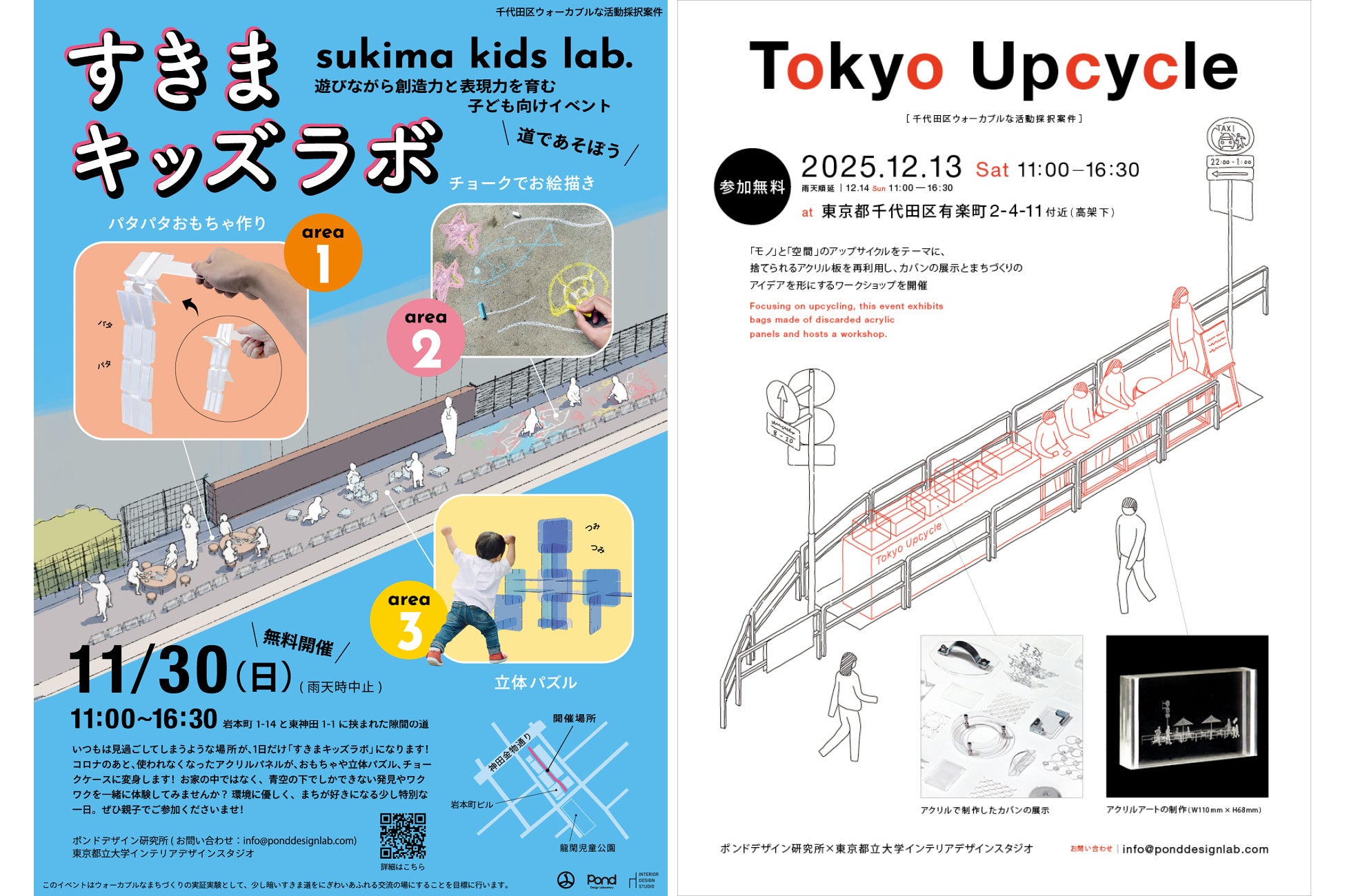 ポンドデザイン研究所は、東京都立大学システムデザイン学部インダストリアルアート学科・学域インテリアデザインスタジオと共同で、千代田区が推進する「ウォーカブルなまちづくり」の一環として、2つのイベント『すきまキッズラボ』『Tokyo Upcycle』を開催します。本イベントは「モノ」と「空間」のアップサイクルをテーマに、役目を終えた新型コロナウイルス感染症対策のパーティションを再利用し、おもちゃや立体アート作品へと価値転換します。舞台となるのは、路上喫煙や不法投棄など地域課題を抱えたすきま道とガードパイプ空間です。「環境配慮 × 地域課題の解決 × 遊び心」を掛け合わせ、歩きたくなる公共空間の創出を目指す取り組みです。