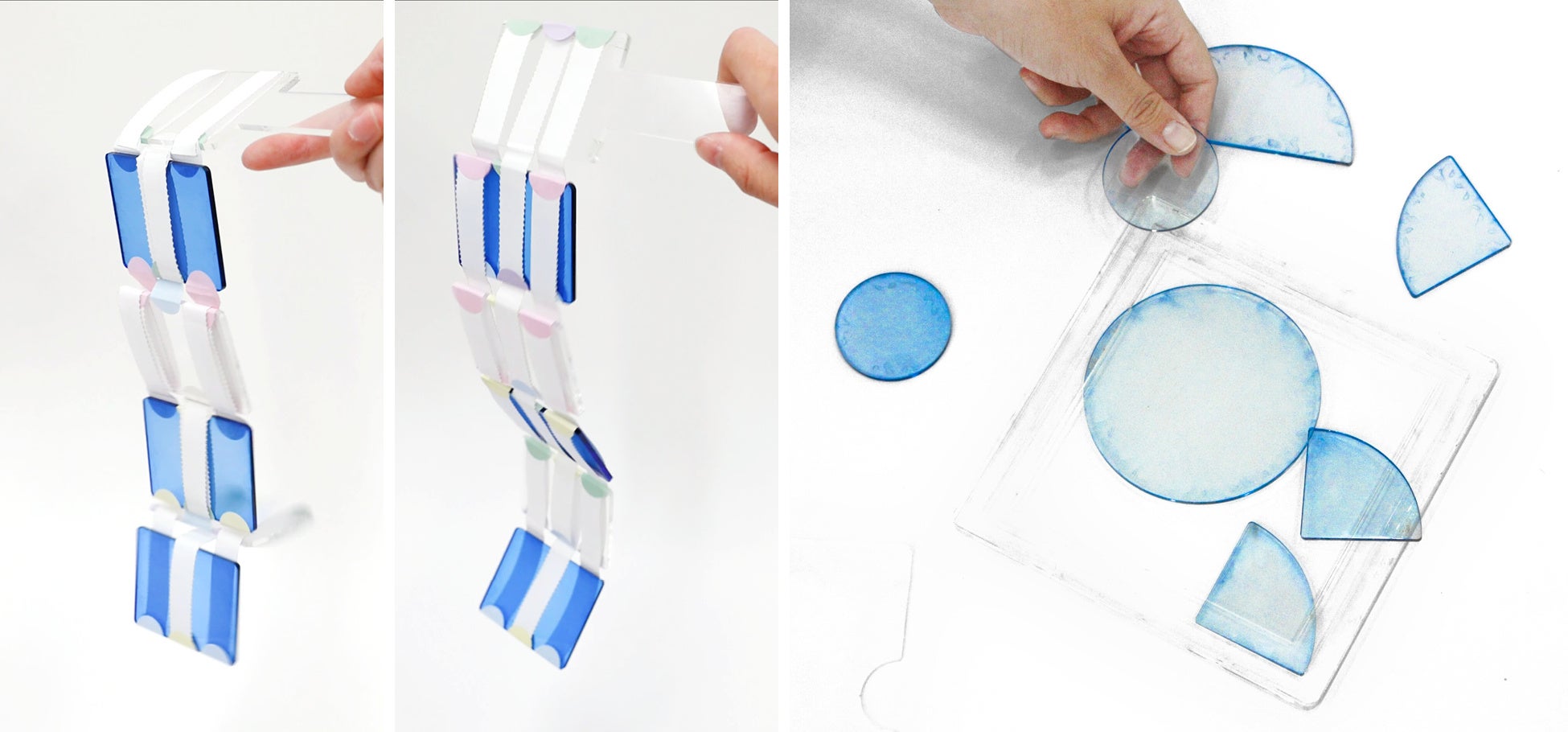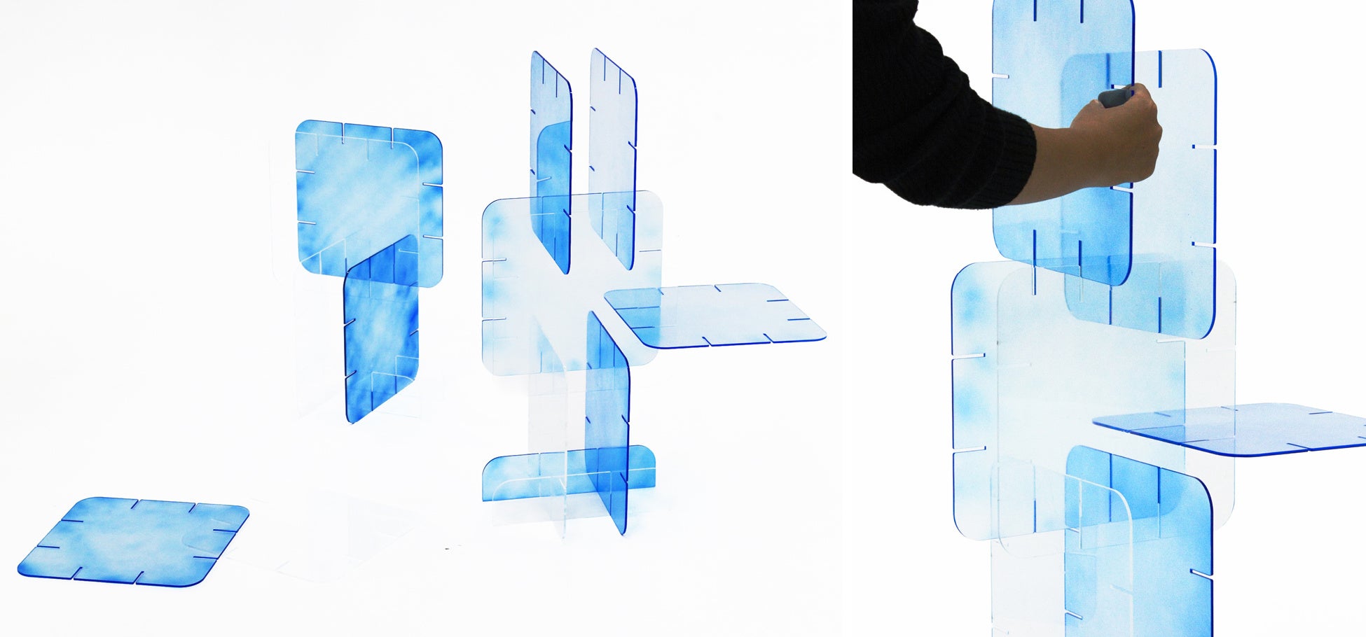 スリットの入ったアクリル板を組み上げることで、さまざまな立体オブジェをつくって遊べます。