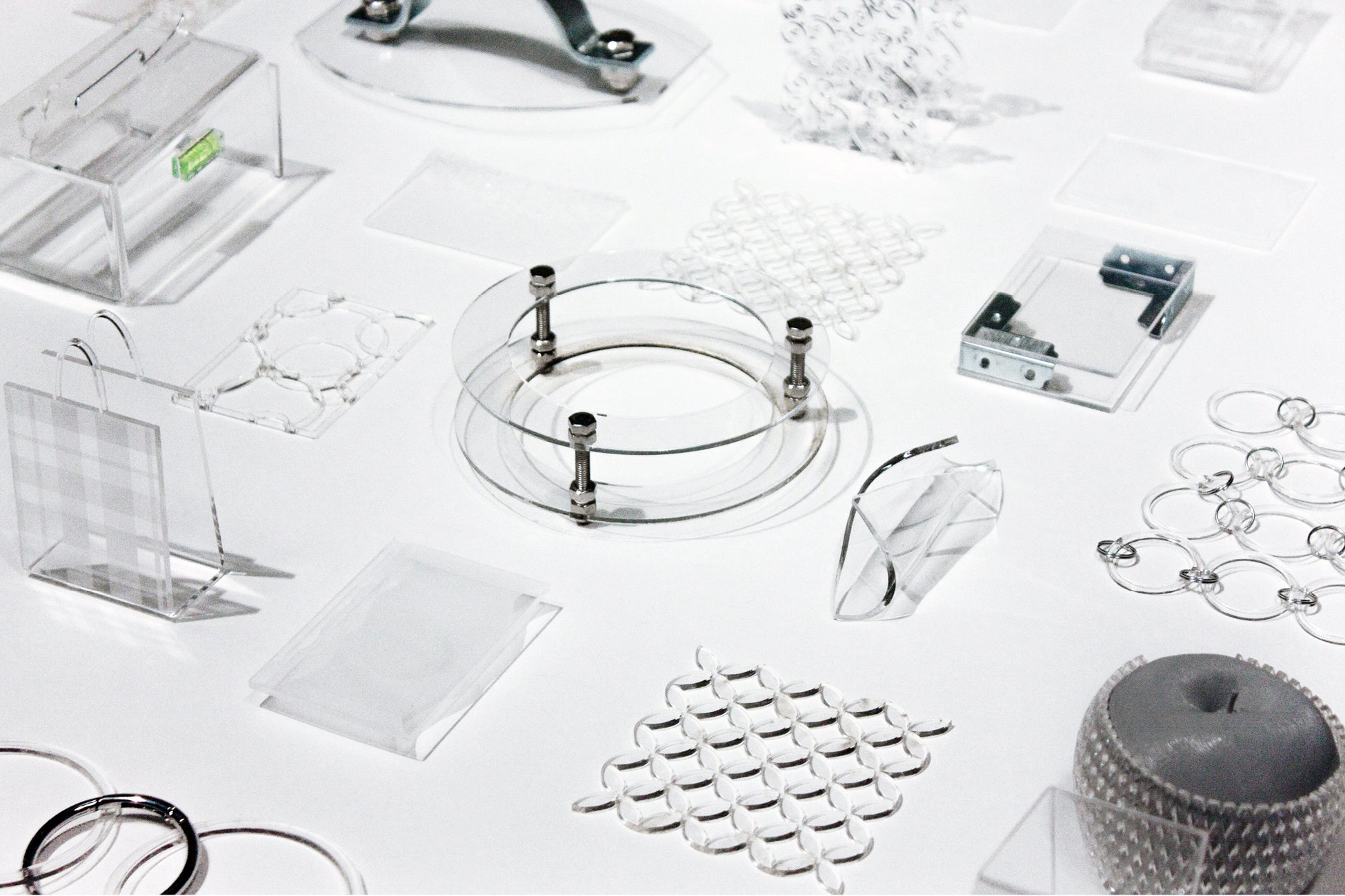 コロナ対策パーティションのアクリル板を「美しいシート状の透明素材」と捉え直し、カバンという“内”と“外”の関係性をもつプロダクトを題材に、6つのデザインスタディを展示します。レーザー加工機によるカットや彫刻、真空成型機による曲げ加工など、多様な技法を用いてアクリル板に新たな価値を吹き込みました。