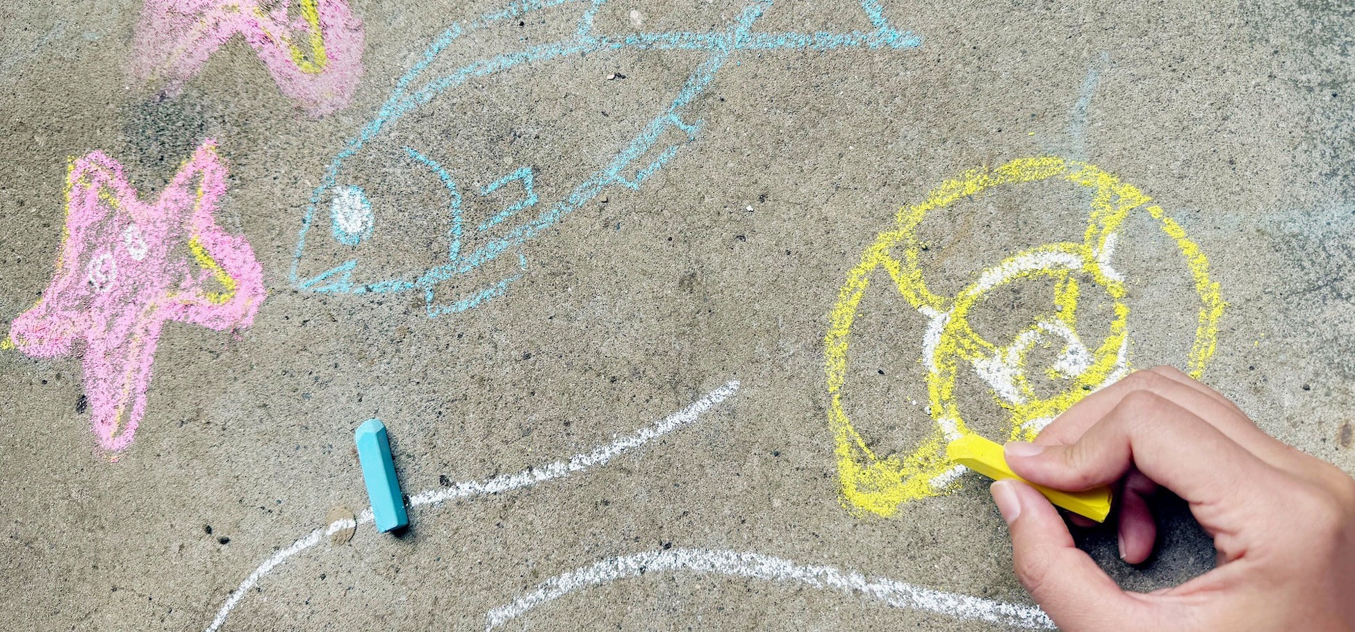 道にチョークで絵を描いたり、カラクリおもちゃを作ったりするなど、遊びながら創造力と表現力を育む子ども向けの屋外イベント