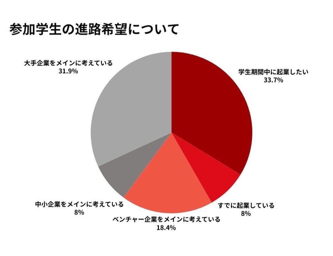 過去に参加した学生たちに対して、進路希望についてアンケートを取ったところ、ベンチャー志向・起業志向の学生が約6割を占めていることがわかりました。