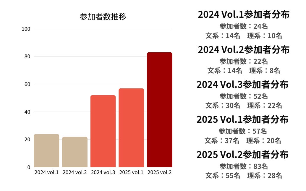 『Origin』は5回の開催を通じて、参加者数・内容ともに毎回アップデートを続けています。特に参加者数は継続的に増加し、挑戦したい学生が集まるコミュニティとして関西圏で確かな存在感を示しています。