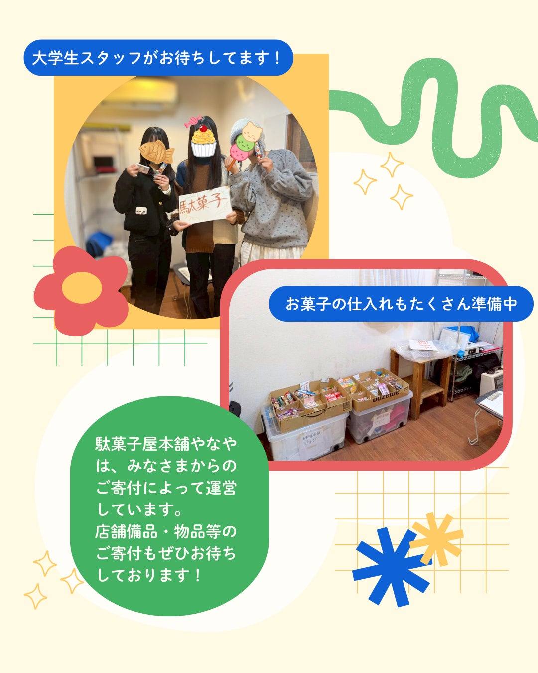 駄菓子屋本舗やなやでは、地域の子どもたちと大学生が共につくり上げる場を目指しています。