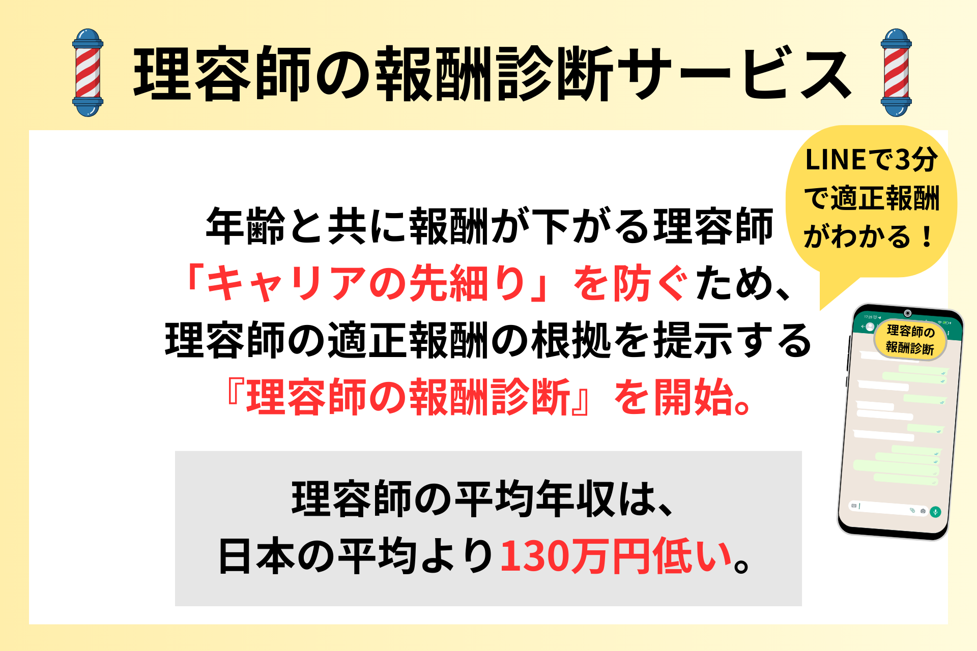 厚生労働省「令和5年 賃金構造基本統計調査」に基づく理容師平均年収(約330万円)は、全職種平均より約130万円低いのが現状です。 この格差を埋めるため、本サービスでは自身の市場価値を可視化し、賃上げ交渉・技術向上・転職のきっかけを提供します。単なる報酬額の提示に留まらず、具体的な交渉術やキャリア形成を伴走支援。代表・佐々木が培った高単価経営の知見を解放し、すべての理容師が正当な報酬を得て、「この道を選んでよかった」と思える未来を創ります。