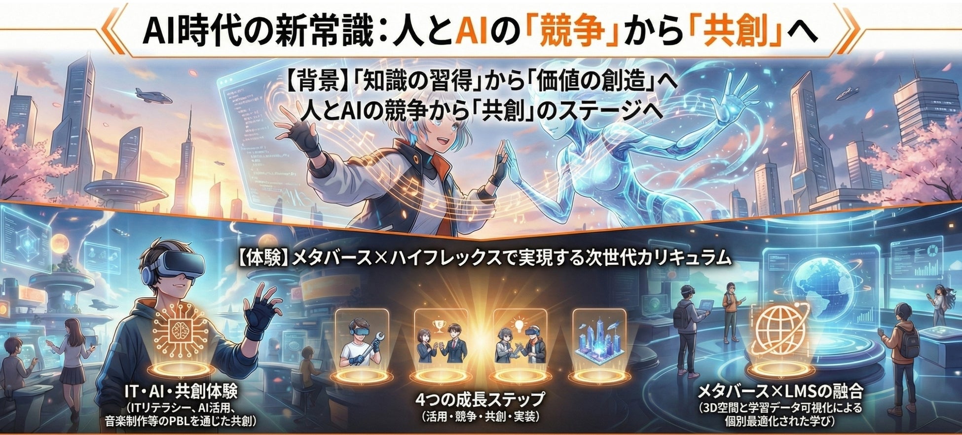 生成AIの進化により、「知識を覚えるだけの学び」から「AIと共に価値を創る学び」への転換が求められています。本プログラムでは、「人とAIの競争から共創へ」をテーマに、IT・AI・クリエイティブを融合した実践型教育を提供します。