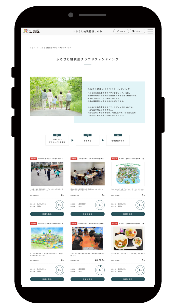 こども食堂支援やナチュラリスティックガーデン整備など全7プロジェクトにわたるクラウドファンディングを実施。また、伝統工芸や区内人気施設のチケットなど魅力的な返礼品で江東区をPR。