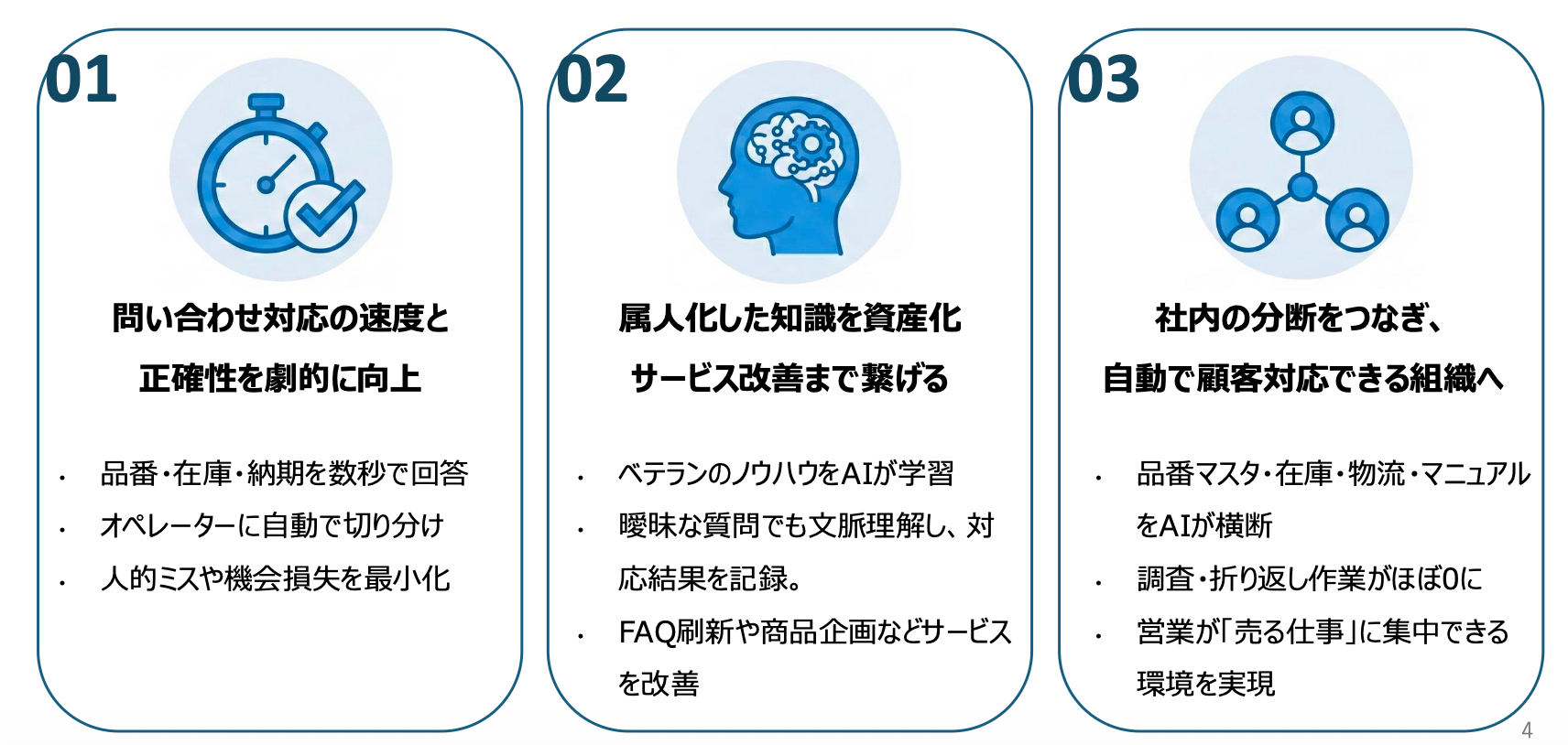 【知識活用】: 膨大なマニュアルやベテランの暗黙知をAIが瞬時に検索。曖昧な問い合わせにも、社内データから正確な情報を導き出します。