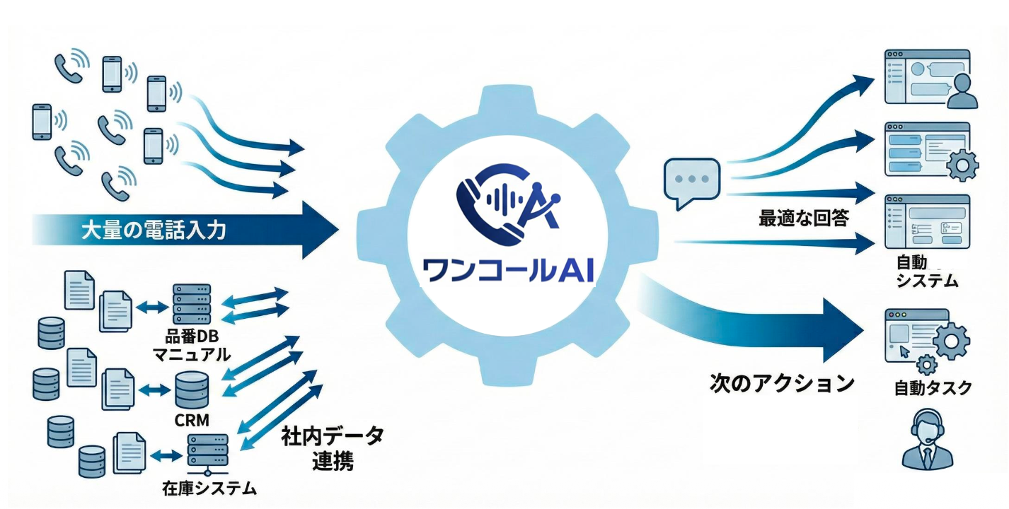 【共通頭脳】: 電話も、チャットも、FAXも。入り口が違っても「裏側のAI」は一つ。だからこそ、重複なく正確に実務をこなせます。