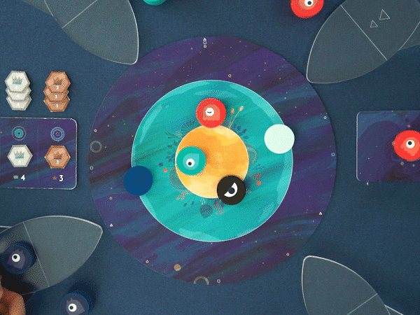 本作は、手元のコマを弾いて惑星に着陸させるアクション性と、着陸した数や強さで勝敗を決める戦略性を融合させたカーリングのようなボードゲームです。