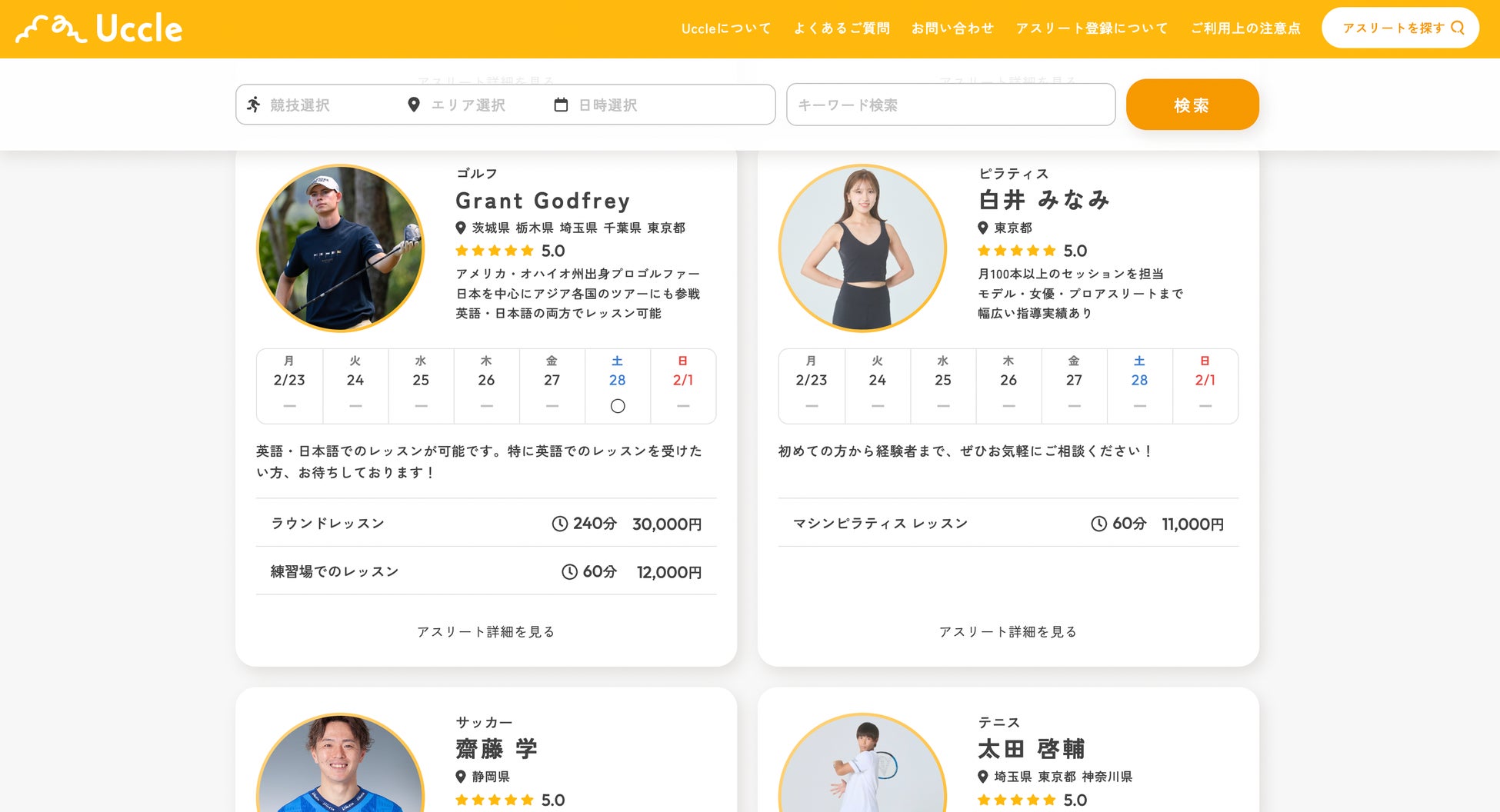 Uccleには審査を通過したアスリートのみが登録されており、プロフィールや競技歴、指導実績、料金等を確認する事ができます。