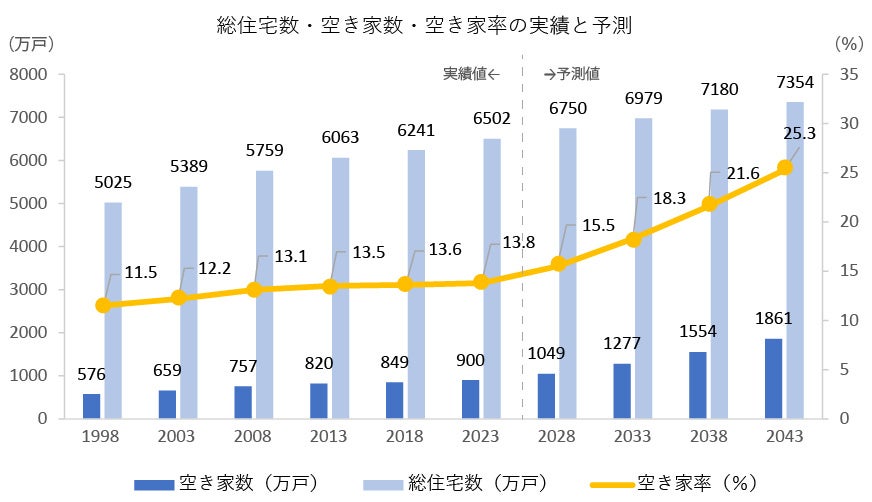 野村総合研究所の最新試算(2024年6月)によると、全国の空き家数は1998年の576万戸から2023年には900万戸へと約1.6倍に増加。今後も人口減少・高齢化の進行により加速度的に増加し、2043年には空き家数が約1,861万戸、空き家率が25.3%に達する見込みです。これは、住宅の4戸に1戸が空き家という深刻な状況を意味します。