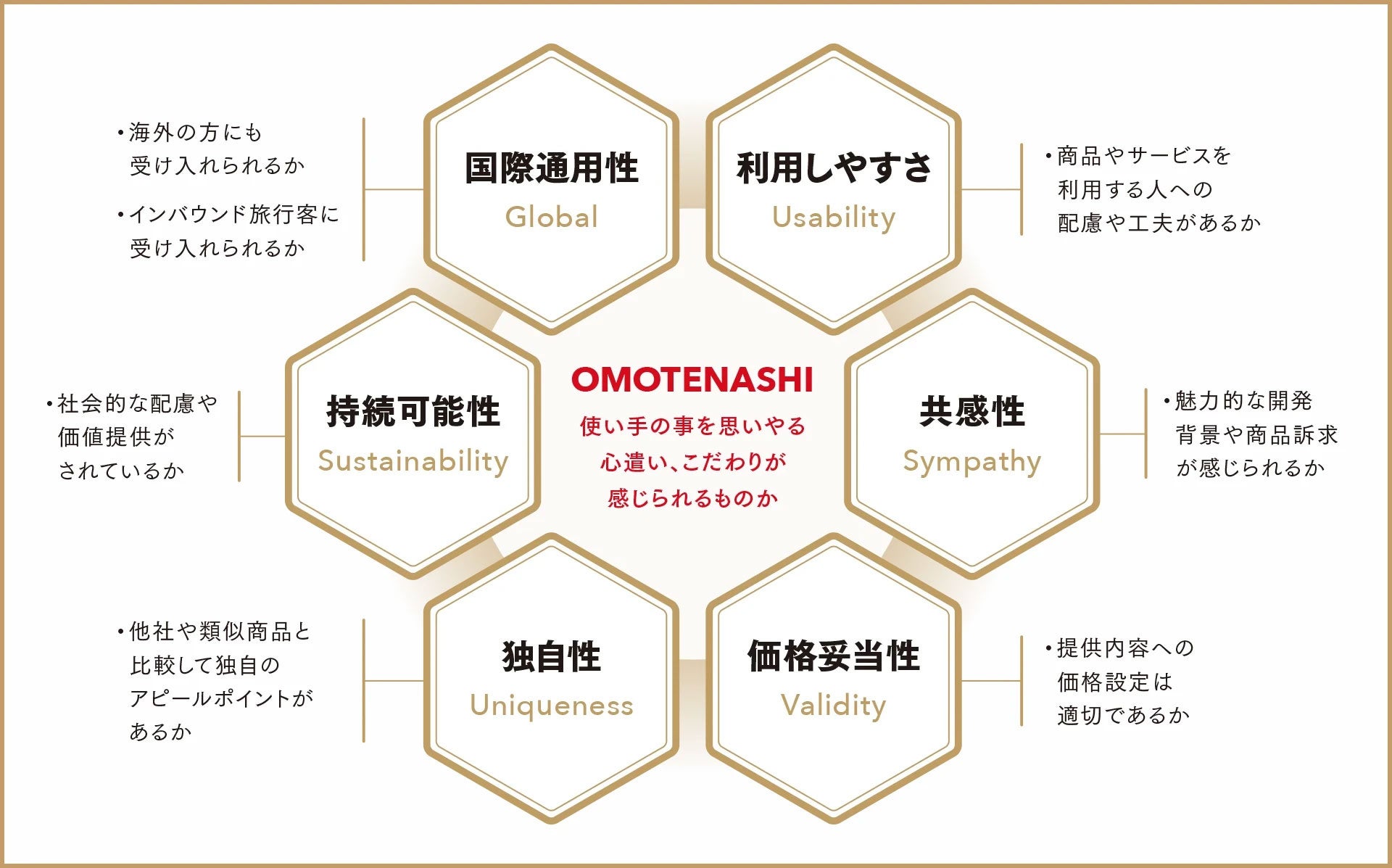 国際通用性・利用しやすさ・共感性・価格妥当性・独自性・持続可能性