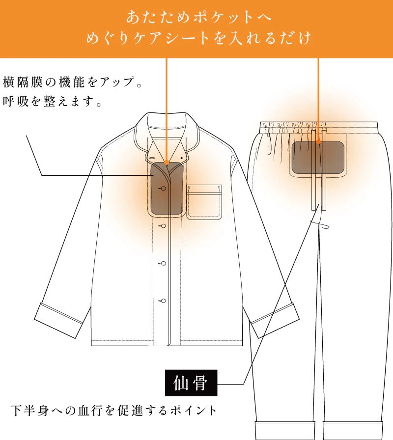 上着には背中(胸椎付近)を心地よく温めるポケット、ズボンには仙骨まわりを包み込むポケットを配置。どちらも植物性炭素繊維「めぐりケアシート」を入れることで、素材が持つ遠赤外線の温熱効果がふんわりと広がります。