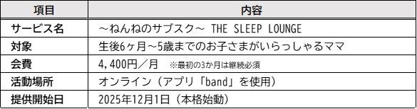 「THE SLEEP LOUNGE(ザ・スリープ・ラウンジ)」は、生後6ヶ月から5歳までのお子さまを持つ保護者を対象とし、BABY SLEEP SCHOOLが培ってきた9年の実績をもとにした子どもの睡眠の情報だけでなく、授乳・離乳食・ママの栄養や産後のボディメイクなど、ママが抱える幅広い育児の悩みに応える「ママのための居場所」として、陽子&祐子に加え外部専門家も交えて多角的なサポートを提供します。