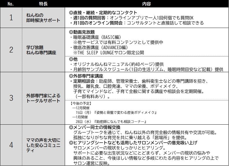 ■ 「THE SLEEP LOUNGE」の4つの特長:ねんねからママの輝きまでを応援
