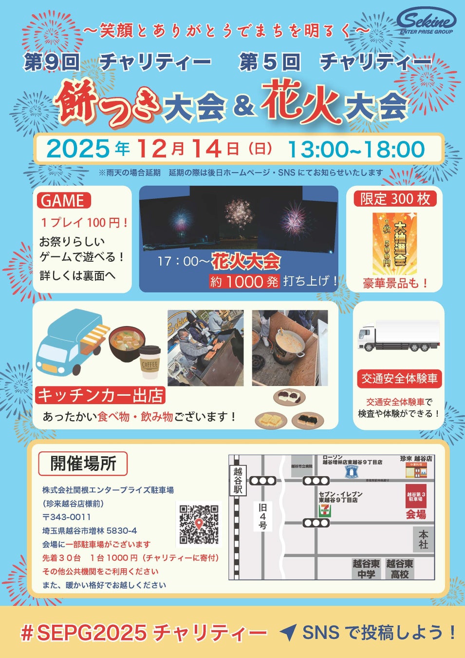 株式会社関根エンタープライズ(本社:埼玉県越谷市増森207-12)代表取締役:関根崇裕は、チャリティーイベントとして地域の皆様への日頃の感謝を形にする為に、子どもから大人まで楽しめる「餅つき大会」と「花火大会」を開催します。