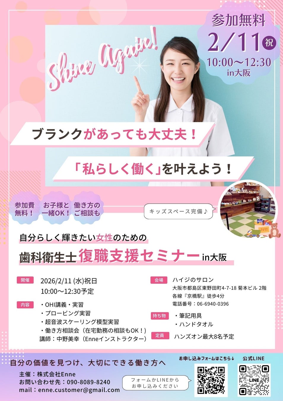 歯科に特化した採用支援・人材紹介事業を展開する株式会社Enne(所在地:兵庫県芦屋市、代表:桑原麻莉)は、同社が運営する歯科人材紹介マッチングサービス「シカリンク」を通じて、こうした悩みを抱える歯科衛生士の復職を支援する無料セミナーを、2026年2月11日(水・祝)10時より大阪市内で開催します。