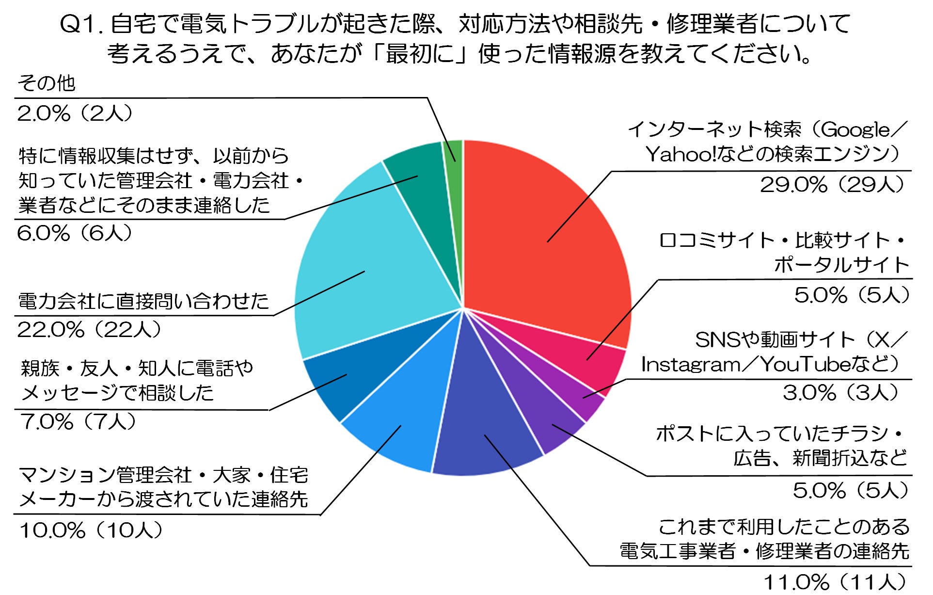Q1. 自宅で電気トラブルが起きた際、対応方法や相談先・修理業者について考えるうえで、あなたが「最初に」使った情報源を教えてください。