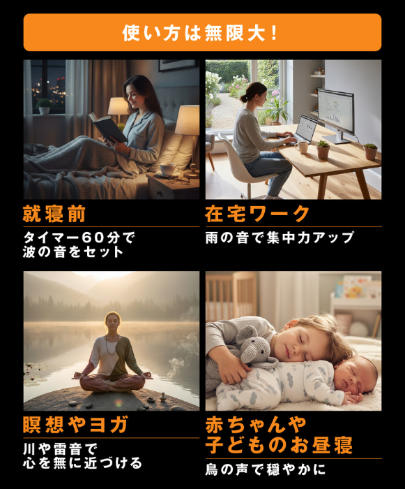 これらのサウンドは、就寝前のタイマー利用、在宅ワーク中の音環境づくり、瞑想やヨガ、赤ちゃんや子どものお昼寝など、使い方は自由自在。