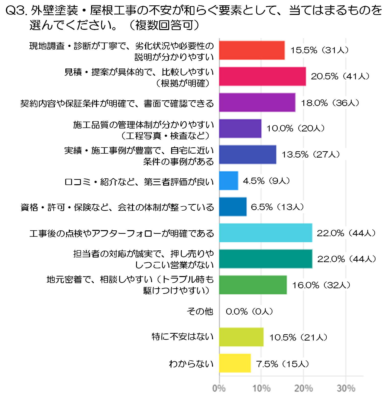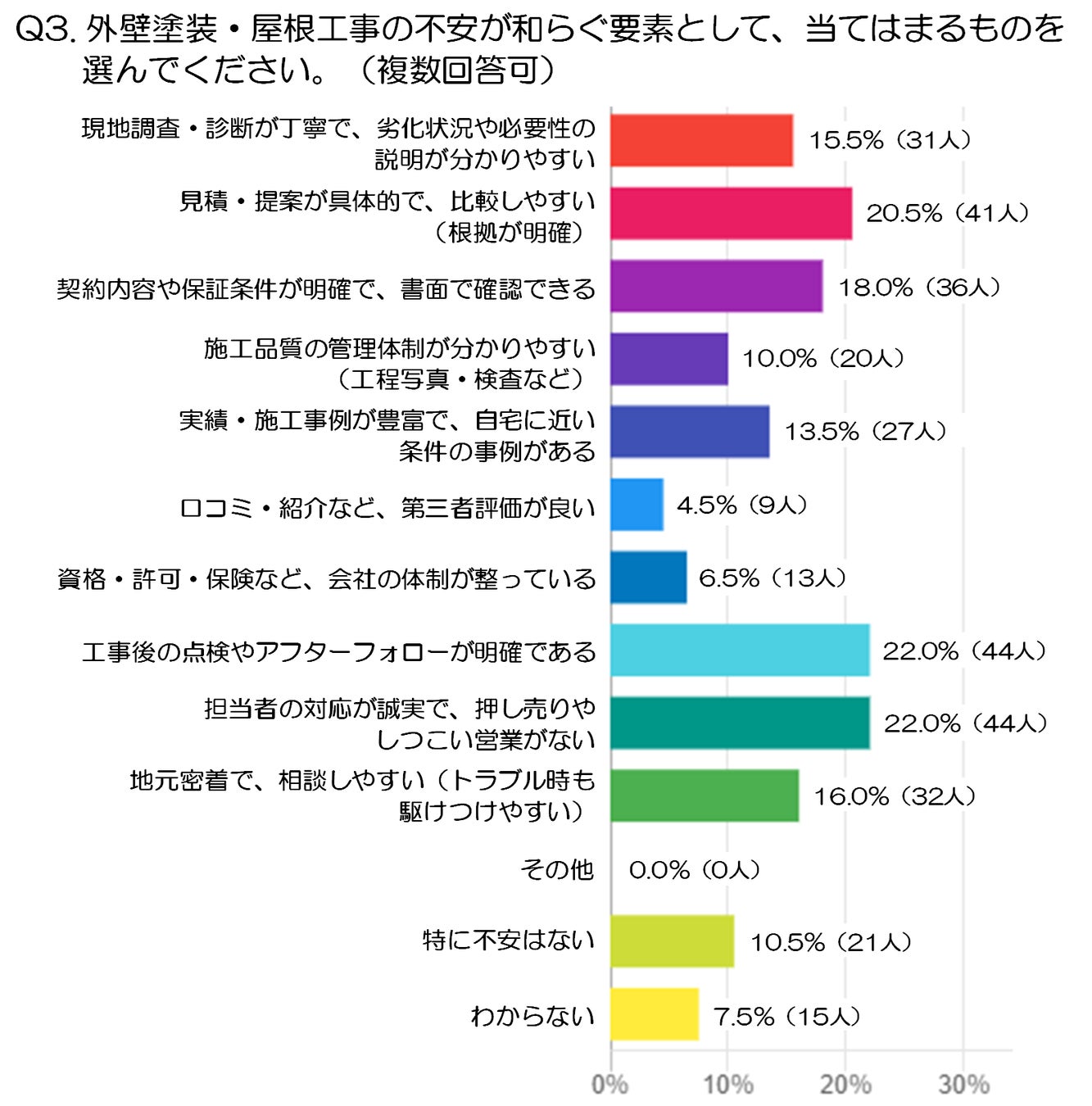 一方で、「工事後にどのくらい長持ちするか不安(耐久性)」は4.5%(9人)にとどまっていますが、これは耐久性への関心が低いというより、まずは契約前の不安のほうが優先されやすいことを示している可能性があります。