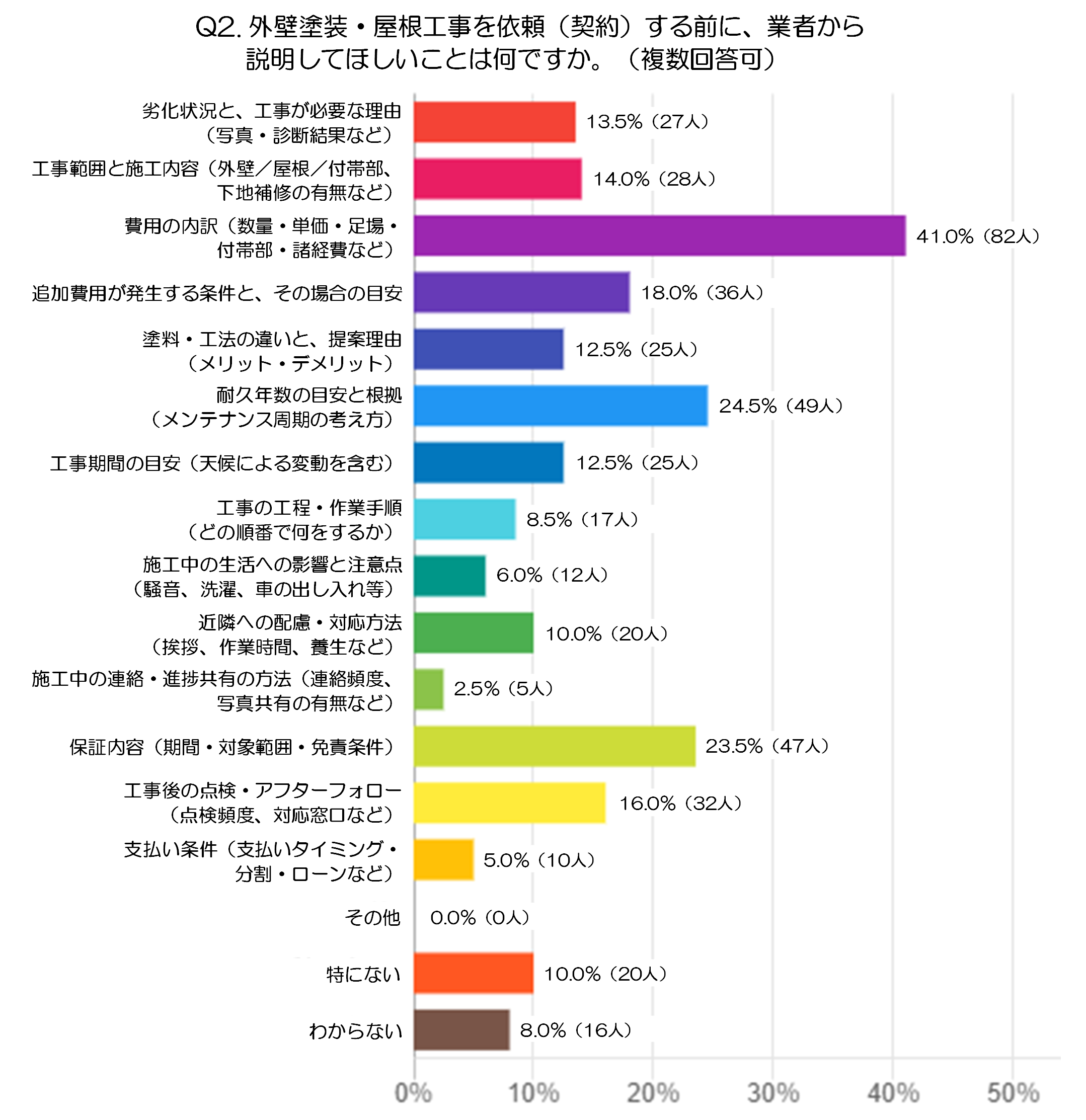 「工事範囲と施工内容(外壁/屋根/付帯部、下地補修の有無など)」は14.0%(28人)、「劣化状況と、工事が必要な理由(写真・診断結果など)」は13.5%(27人)でした。どこをどこまで工事するのか、なぜ必要なのかは、専門知識がないと判断しにくい部分です。言葉だけでなく、写真や診断結果を見ながら説明してほしいと感じる場面も多そうです。