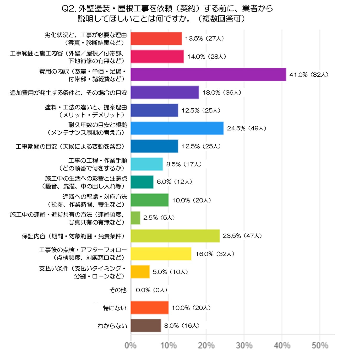 最も多かったのは「費用の内訳(数量・単価・足場・付帯部・諸経費など)」41.0%(82人)でした。外壁塗装や屋根工事の見積もりには、普段あまり見慣れない項目も多いため、総額だけでなく、何にいくらかかるのかまで確認したいと感じる人が多いようです。足場代や付帯部、諸経費などは金額差も出やすく、契約前にしっかり説明を受けたいと考えるのも自然です。