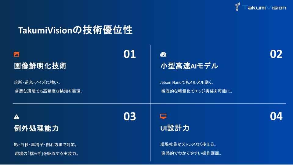 TakumiVisionでは今後、鉄道会社や介護施設などと連携しながら、転倒・転落検知AIの導入を進め、安全インフラの高度化に貢献していきます。