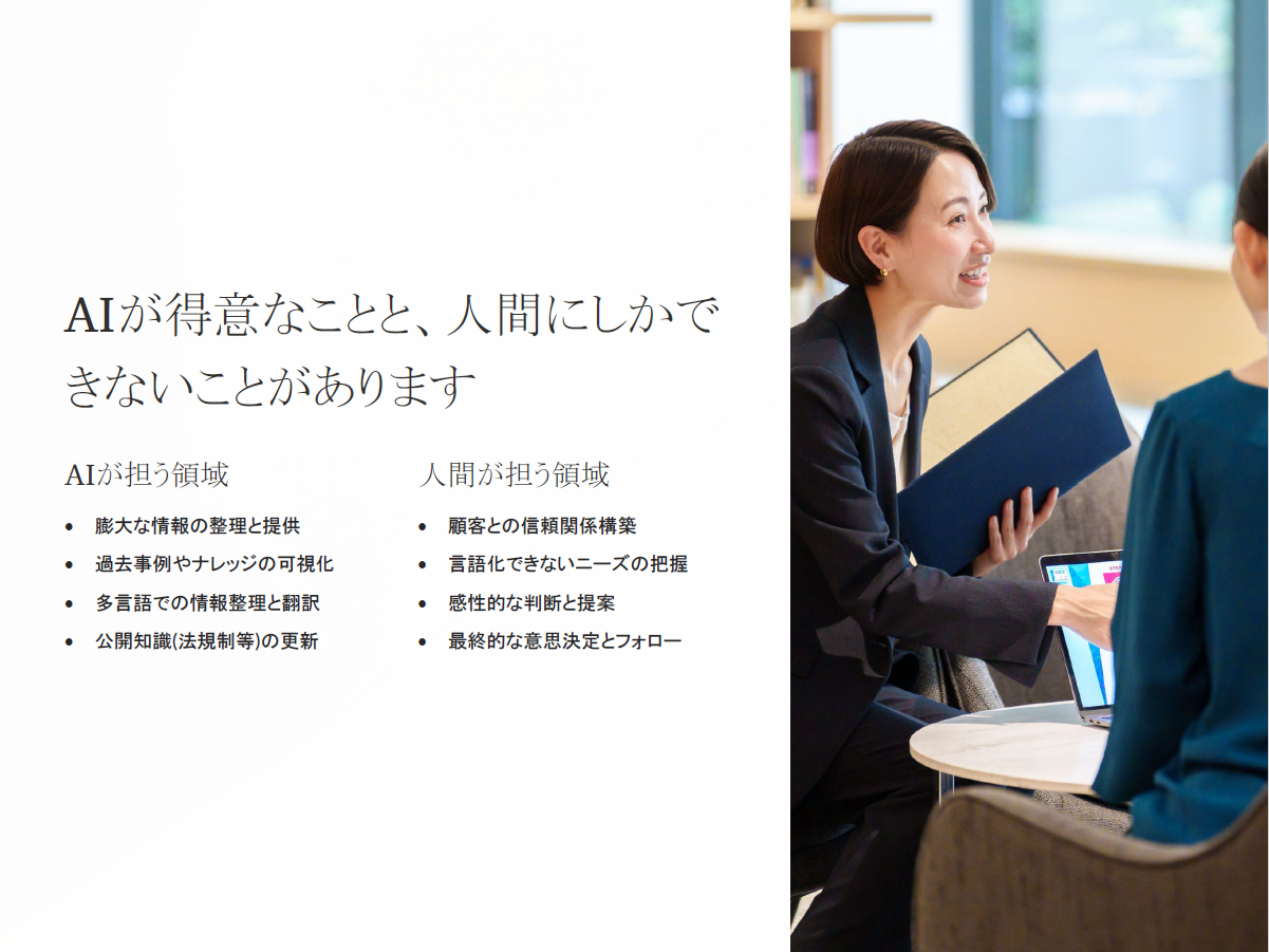 といった領域でAIが社員を支え、各社員が本来注力すべき「対話」や「判断」の質を高める存在になることで、クライアントに寄り添う人間中心の価値創造を目指します。そして、AIを活用して知識の民主化を図り、社員全員がより高いレベルでのグローバル対応力を身に付けることを目的としています。