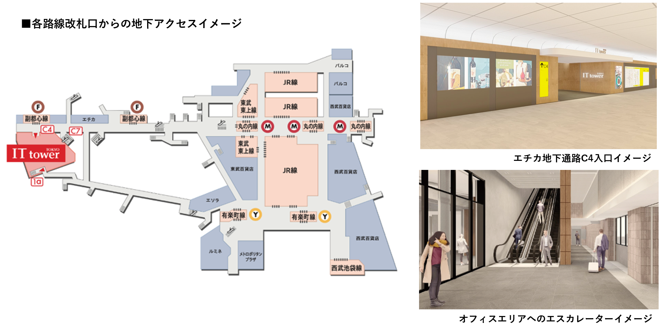 池袋駅は、1日約235万人が利用するメガターミナルとして、都心へのアクセスも快適かつ高い交通利便性を有しています。「IT tower TOKYO」は、JR各線(山手線・埼京線・湘南新宿ライン)、東京メトロ各線(丸の内線・有楽町線・副都心線)、東武東上線、西武池袋線の8路線の各改札から地下通路でつながり、雨天時でも雨に濡れることなく、オフィスロビーまでダイレクトにアプローチが可能。また、東武百貨店、西武百貨店、ルミネ、パルコ、エソラ、エチカ等の商業施設にも地下通路でつながっています。