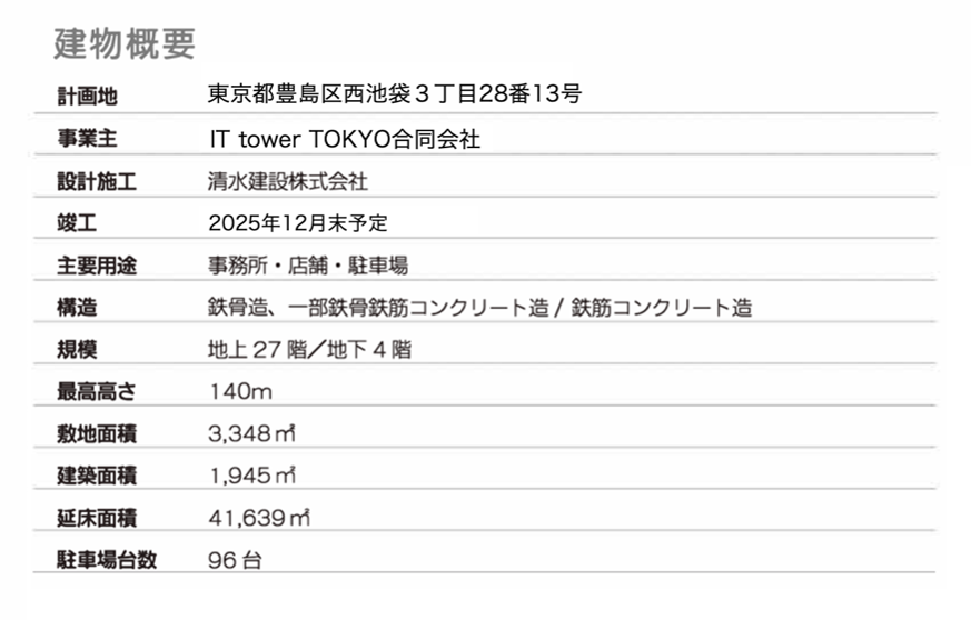 「IT tower TOKYO」は、高さ140m、地上27階、地下4階、延床面積41,639㎡、敷地面積3,348㎡に及ぶ、池袋西口エリアの新たなランドマークとなる超高層複合オフィスビルとなります。