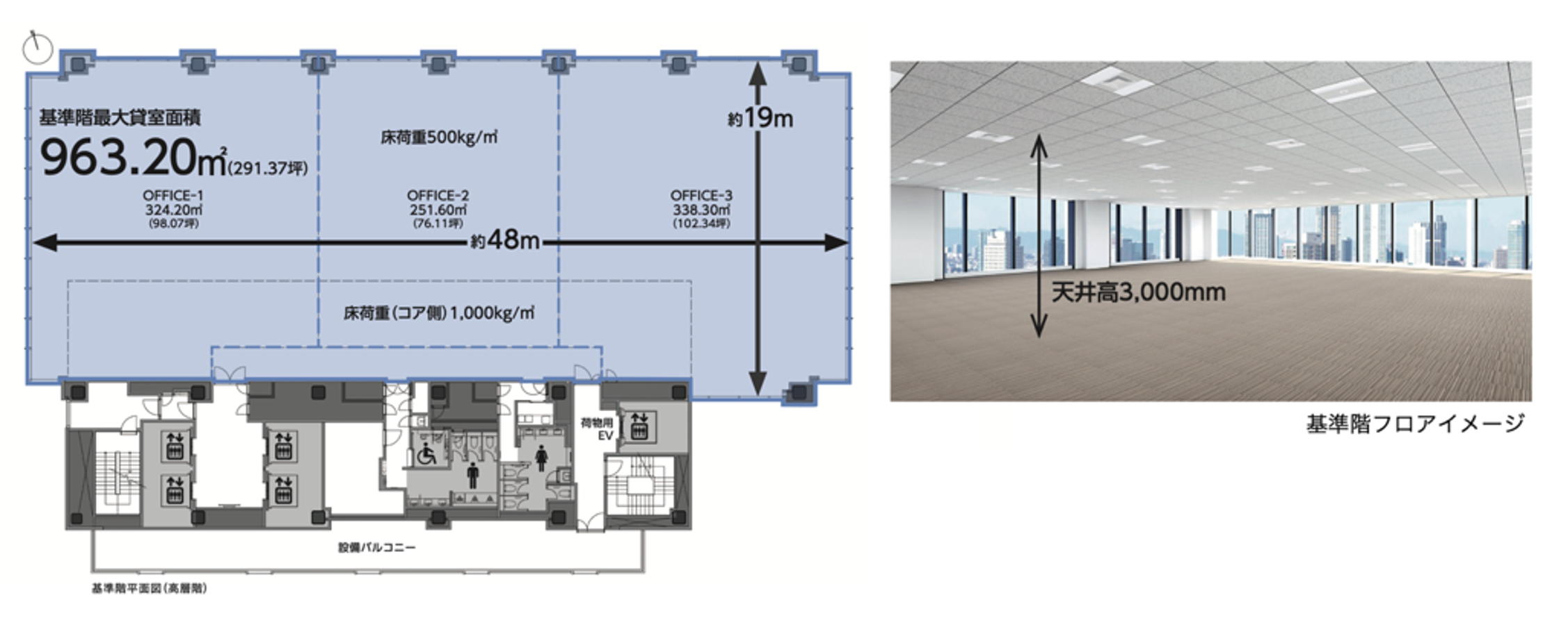 基準階オフィスフロアは、963.20㎡(291.37坪)の空間。天井高は3,000mmを確保し、ゆとりある広さと開放感にあふれた最先端の設備を備えたオフィス環境をご提供いたします。開放的で自由度の高い整形無柱オフィス空間で、部門の枠を超えたチームコミュニケーションの活性化や社内外メンバーとのイノベーション促進のためのコミュニケーション効率をさらに高めることができ、イノベーション創出を加速する、多様な働き方にフレキシブルに対応することができます。
