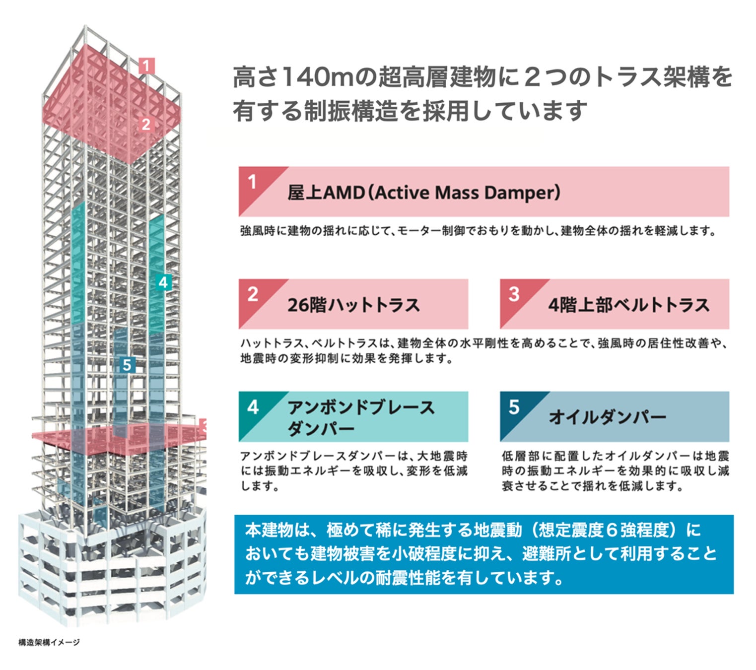 4)高さ140mの超高層建物に2つのトラス架構を有する制振構造を採用