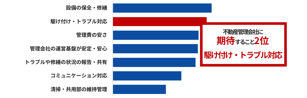 不動産管理会社に期待することの第2位は「駆け付け/トラブル対応」であり、第1位の「設備の保全・修繕」とは僅差。