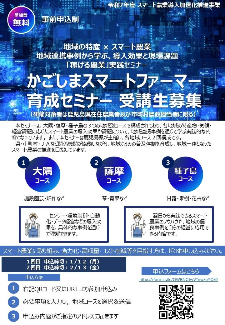 鹿児島県主催 令和7年度「かごしまスマートファーマー育成セミナー」受講生募集