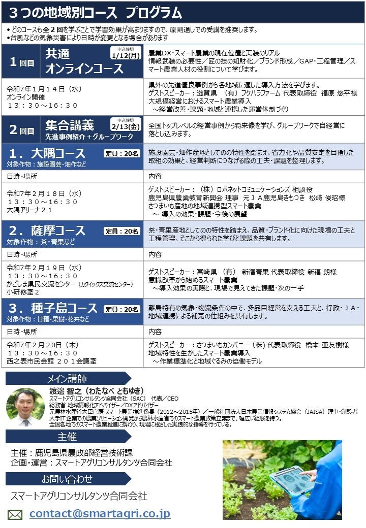 鹿児島県は、「令和7年度 スマート農業導入加速化推進事業」の一環として、「かごしまスマートファーマー育成セミナー」を2026年1月から2月にかけて開催します。本セミナーの企画・運営は、スマートアグリコンサルタンツ合同会社(代表:渡邊智之)が担当します。